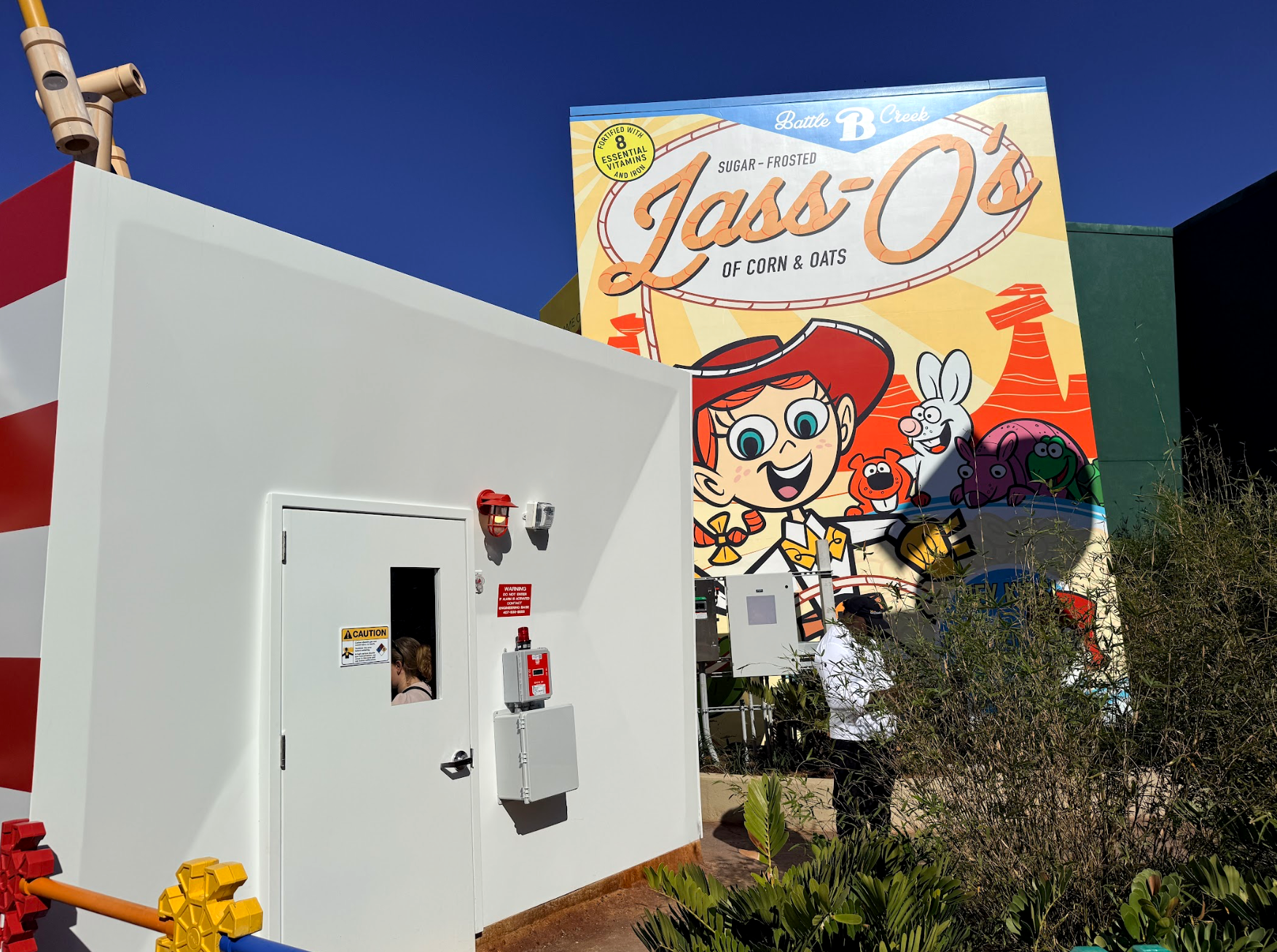 - From the stand, you can see the large Lass-Os “cereal box” hiding the Toy Story Mania building.