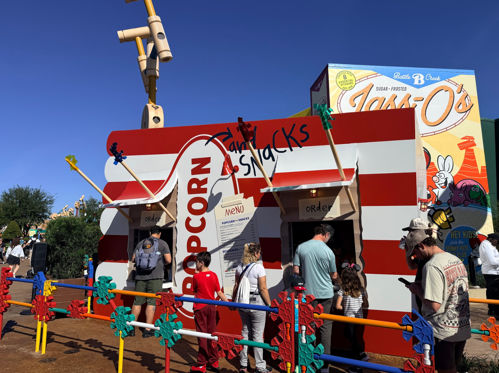 - From the stand, you can see the large Lass-Os “cereal box” hiding the Toy Story Mania building.