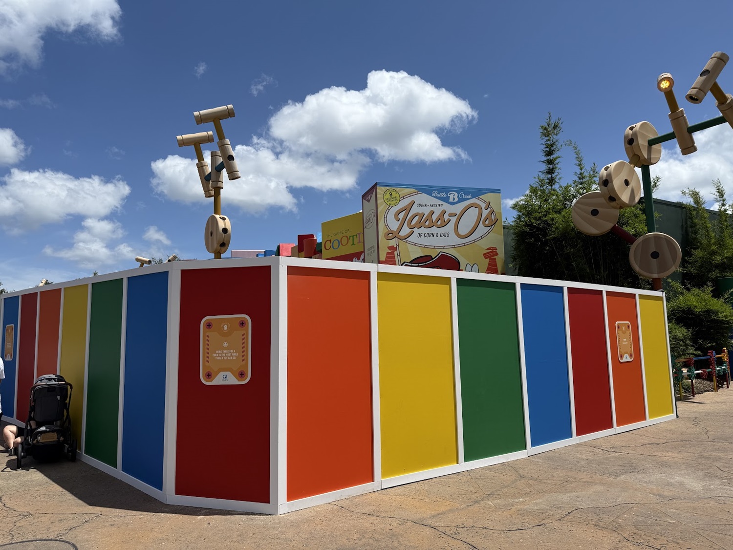 New construction walls have appeared in Toy Story Land at Disney’s Hollywood Studios, featuring the bright colors indicative of the landmark film and its subsequent franchise. The bright reds, yellows, and blues can be found with different quotes of the film, blocking off work being done near the land’s restrooms.