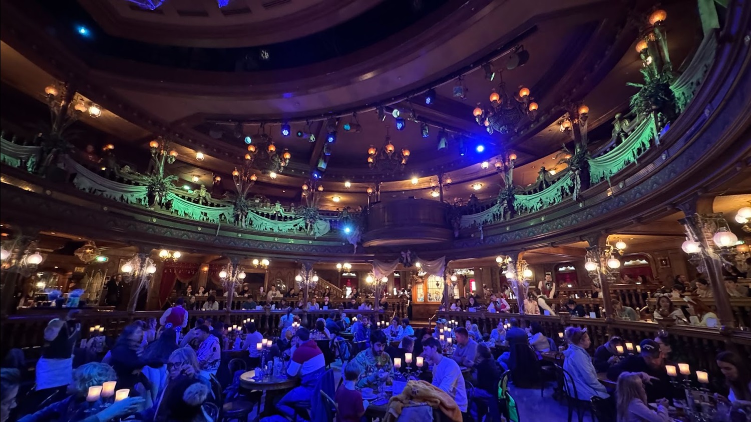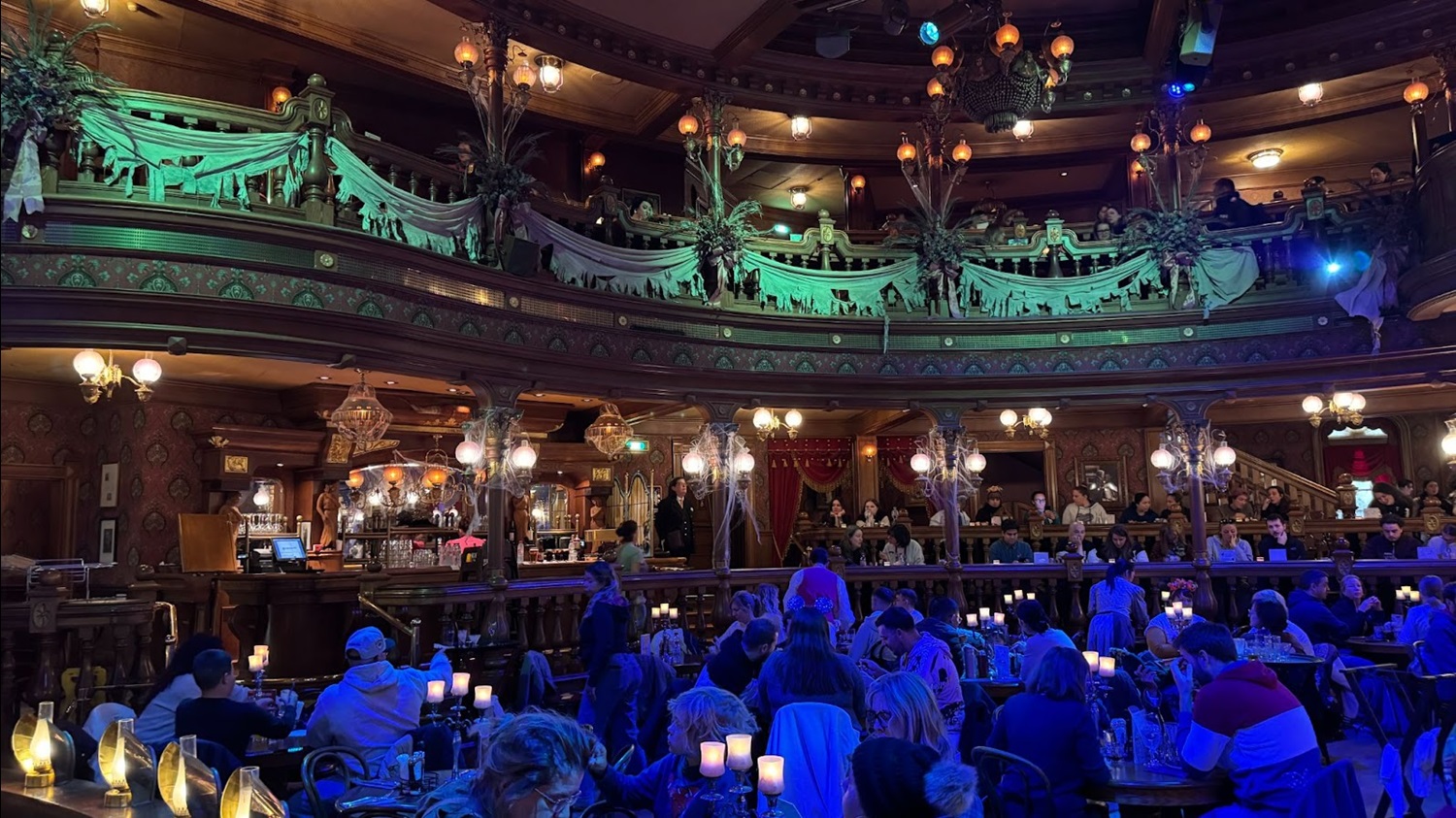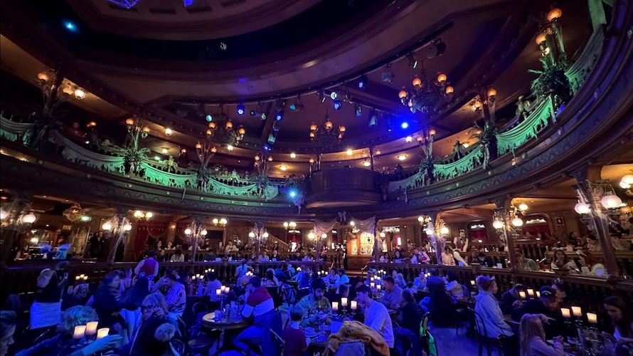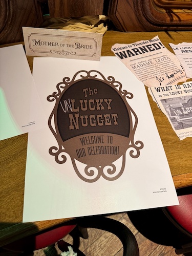 The Unlucky Nugget Saloon is meant to evoke an area that was once a glorious reception venue before it became abandoned. The story created by Disney Imagineers envisions the restaurant as the intended location for a reception in celebration of the impending wedding of Melanie Ravenswood – Phantom Manor’s version of The Haunted Mansion’s Bride. The reception never happened due to the mysterious disappearance of the groom and now the building has fallen into disrepair, much like Phantom Manor itself.