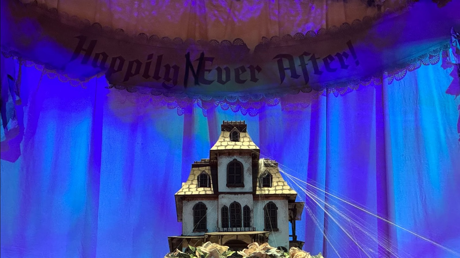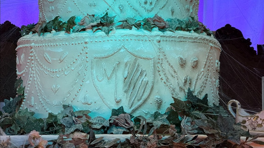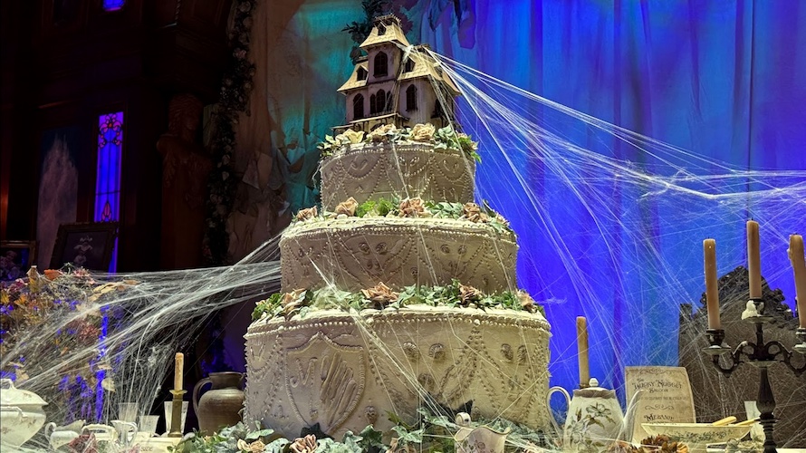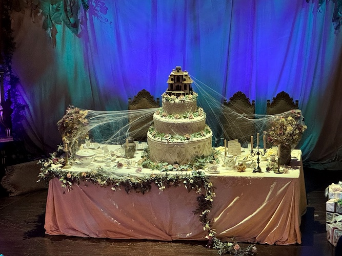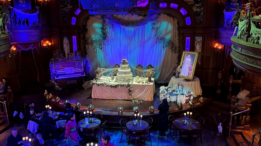 On the saloon’s stage, a grand, yet decrepit wedding cake stands with the Ravenswood Manor serving as the cake topper.