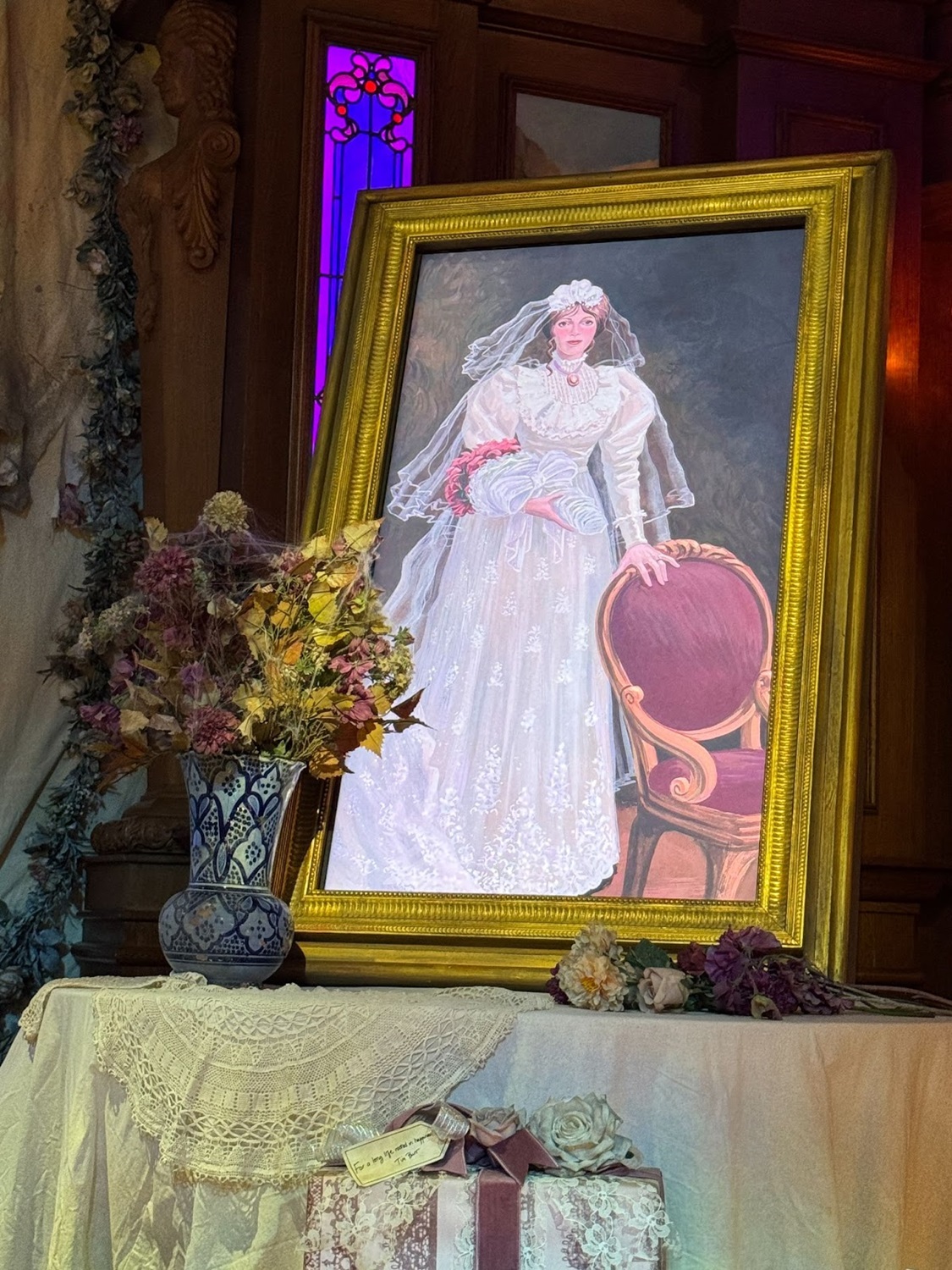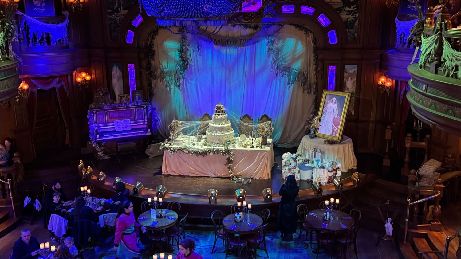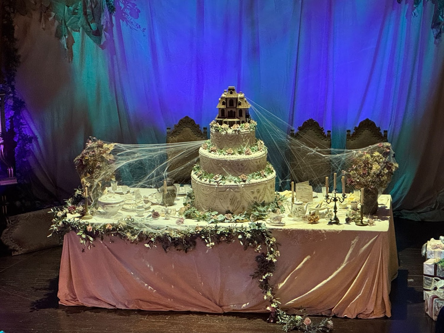 On the saloon’s stage, a grand, yet decrepit wedding cake stands with the Ravenswood Manor serving as the cake topper.
