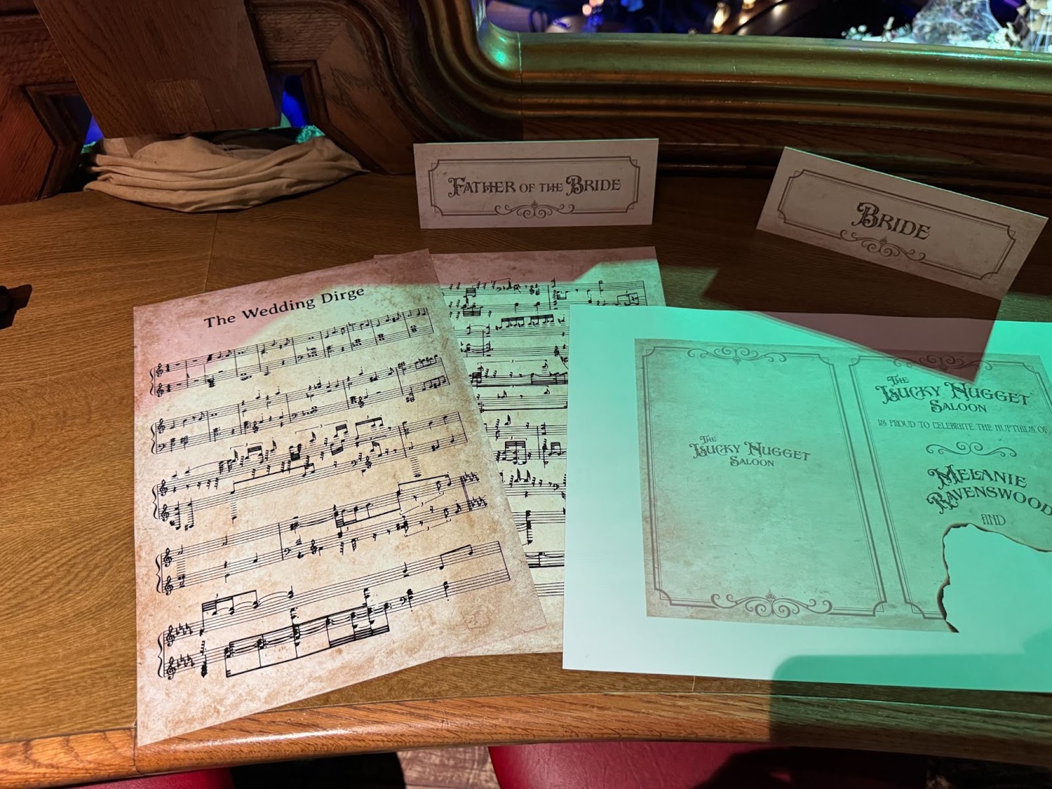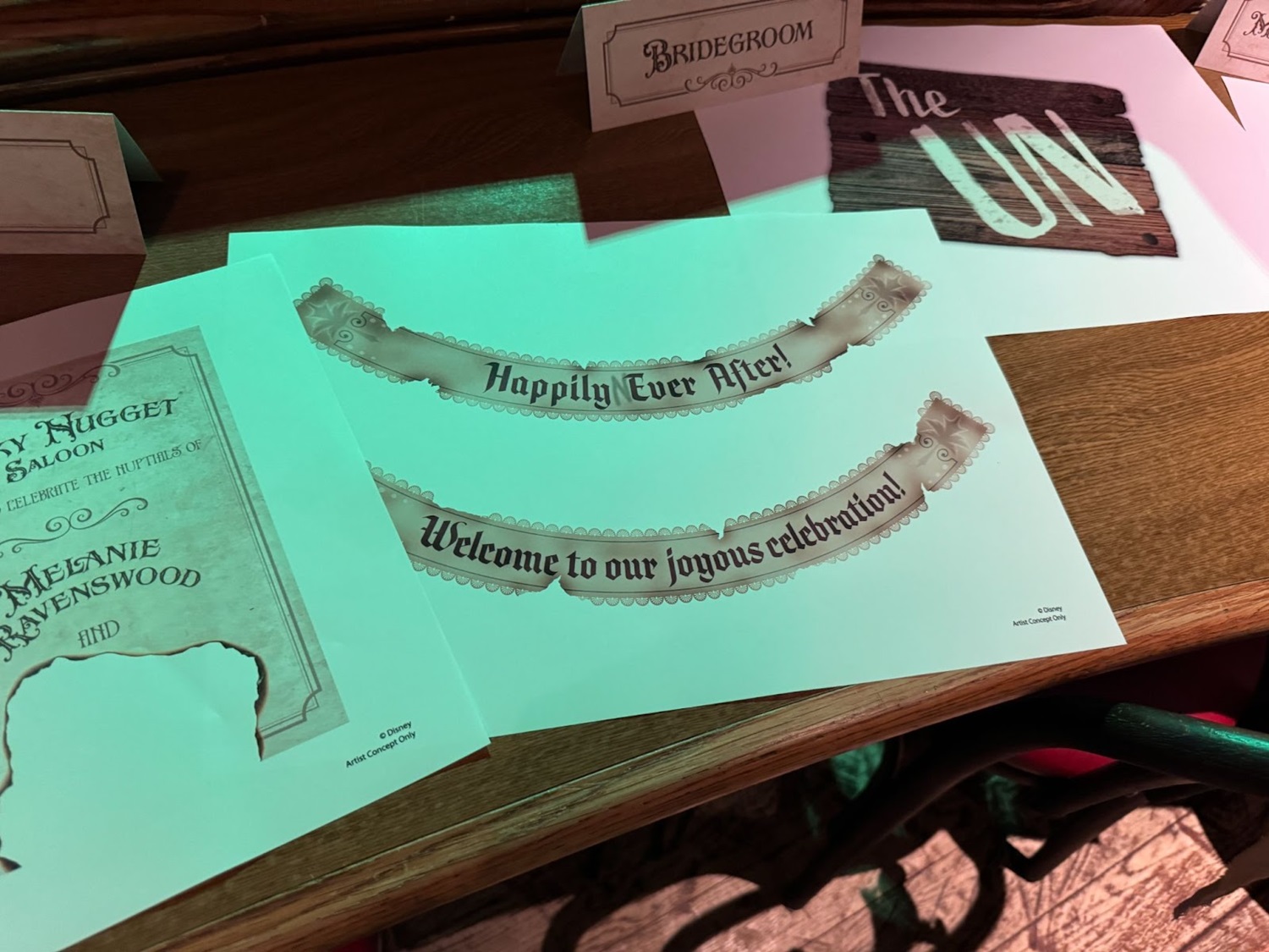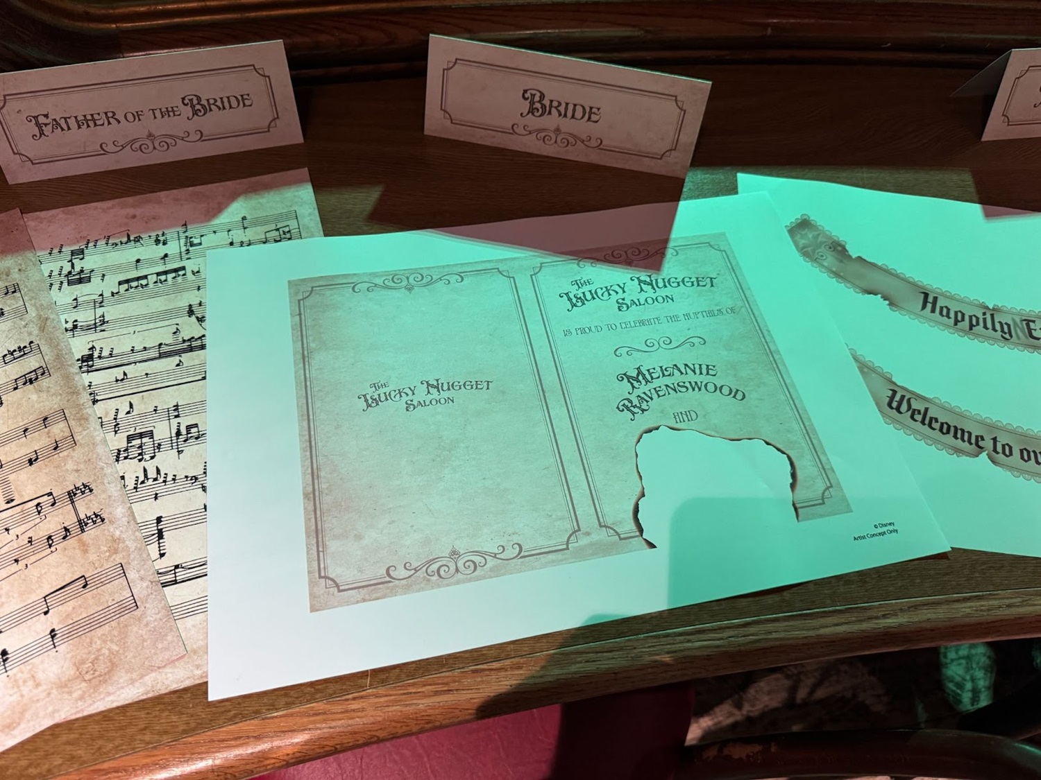 Disney Imagineer Thomas Levert notes that, if you look at the decorations, “The name of Melanie Ravenswood’s groom is never visible. The mystery remains unsolved! In fact, the four menus placed on the main table are a perfect example — the groom’s name is always erased, just like the four vanished suitors."