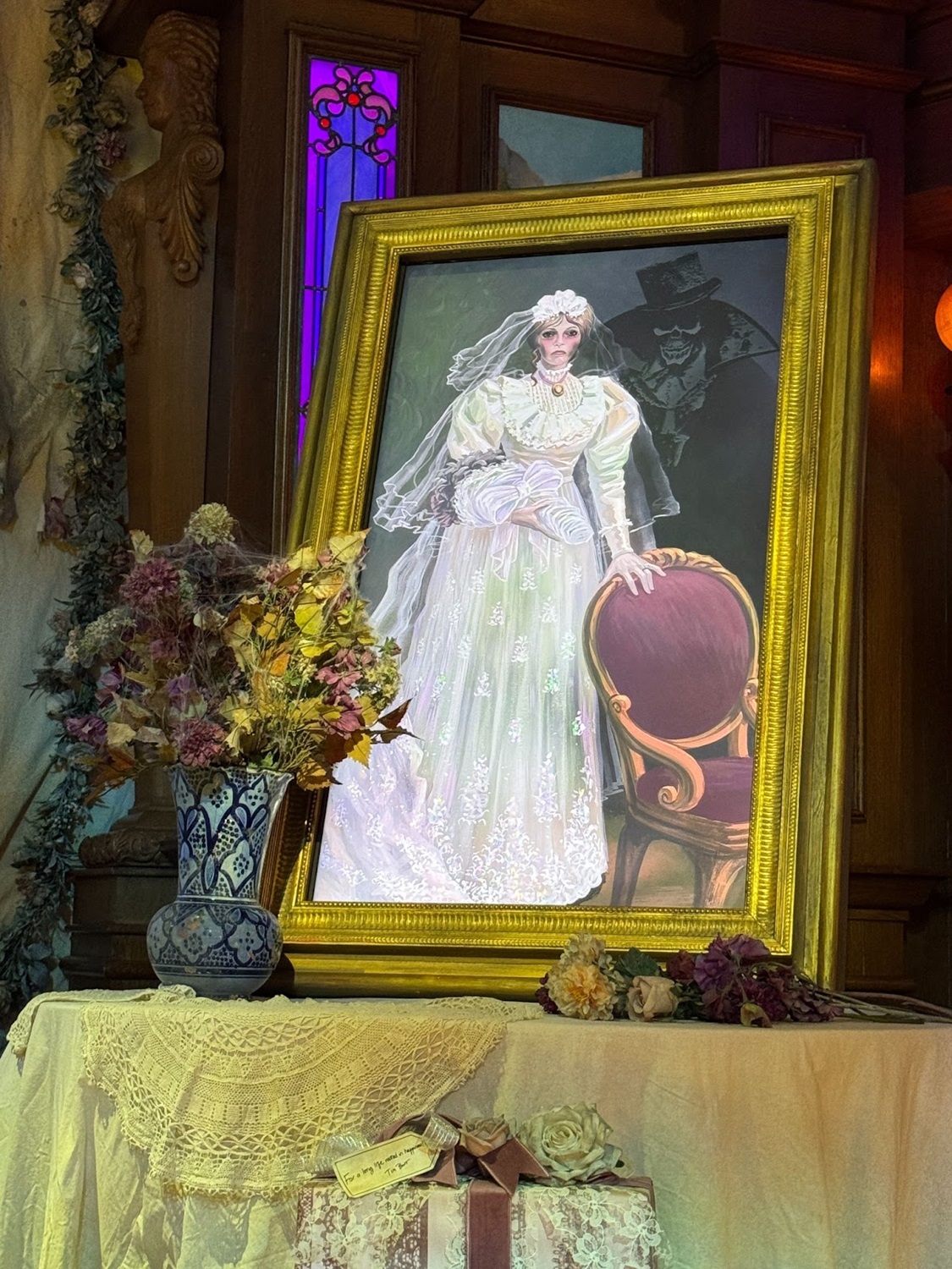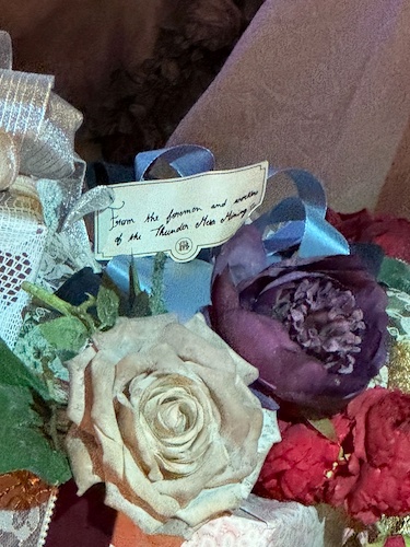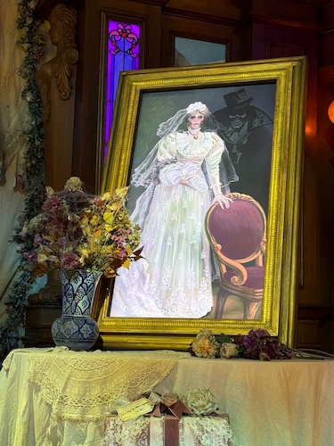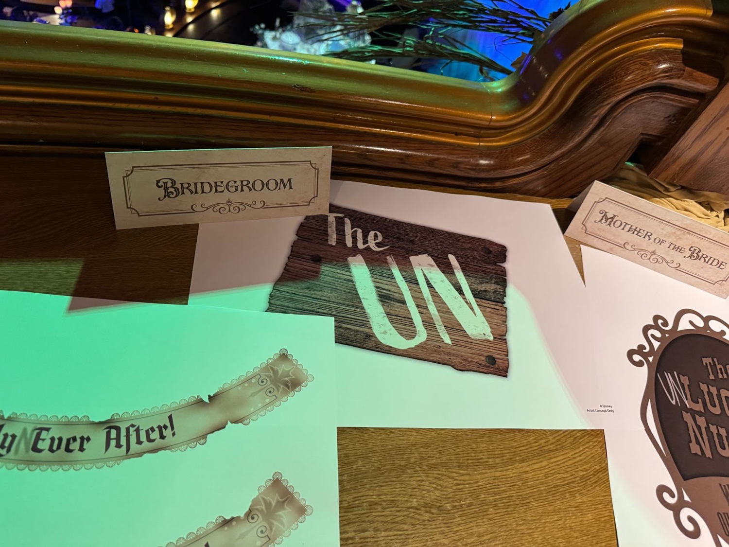 Disney Imagineer Thomas Levert notes that, if you look at the decorations, “The name of Melanie Ravenswood’s groom is never visible. The mystery remains unsolved! In fact, the four menus placed on the main table are a perfect example — the groom’s name is always erased, just like the four vanished suitors."