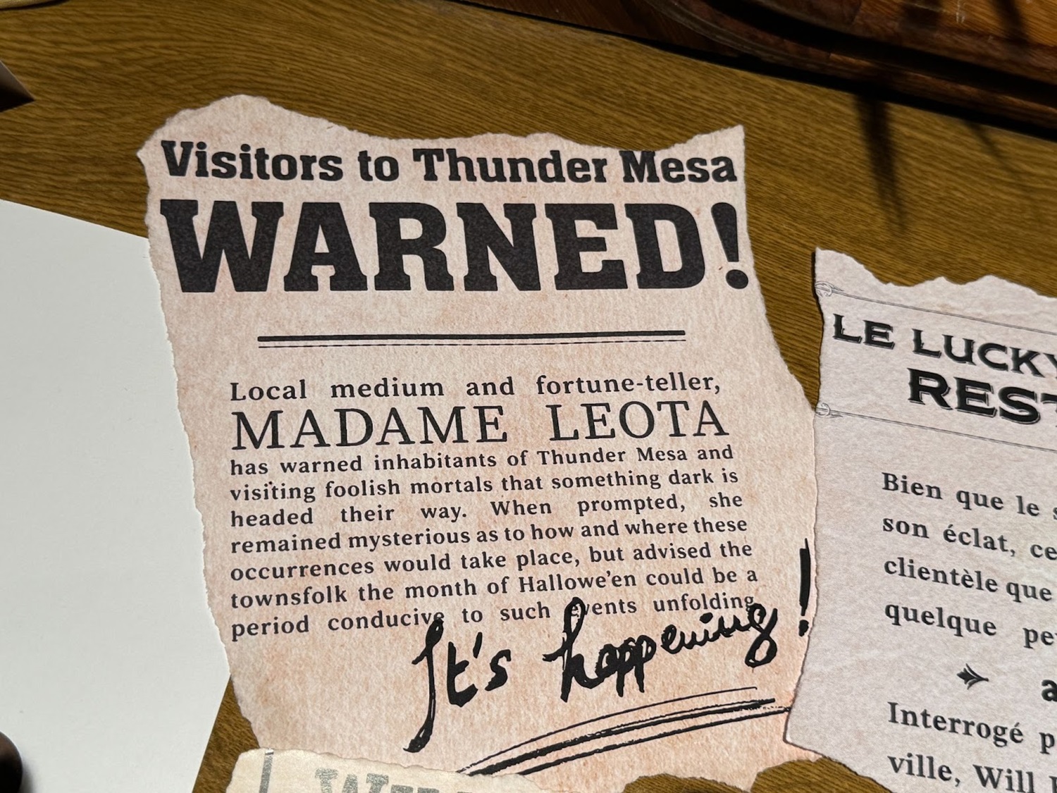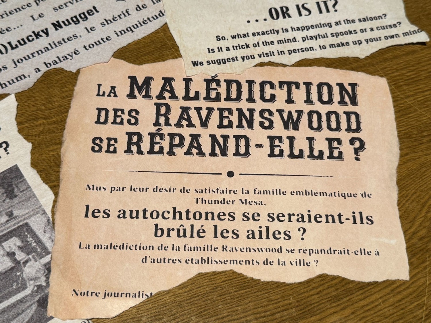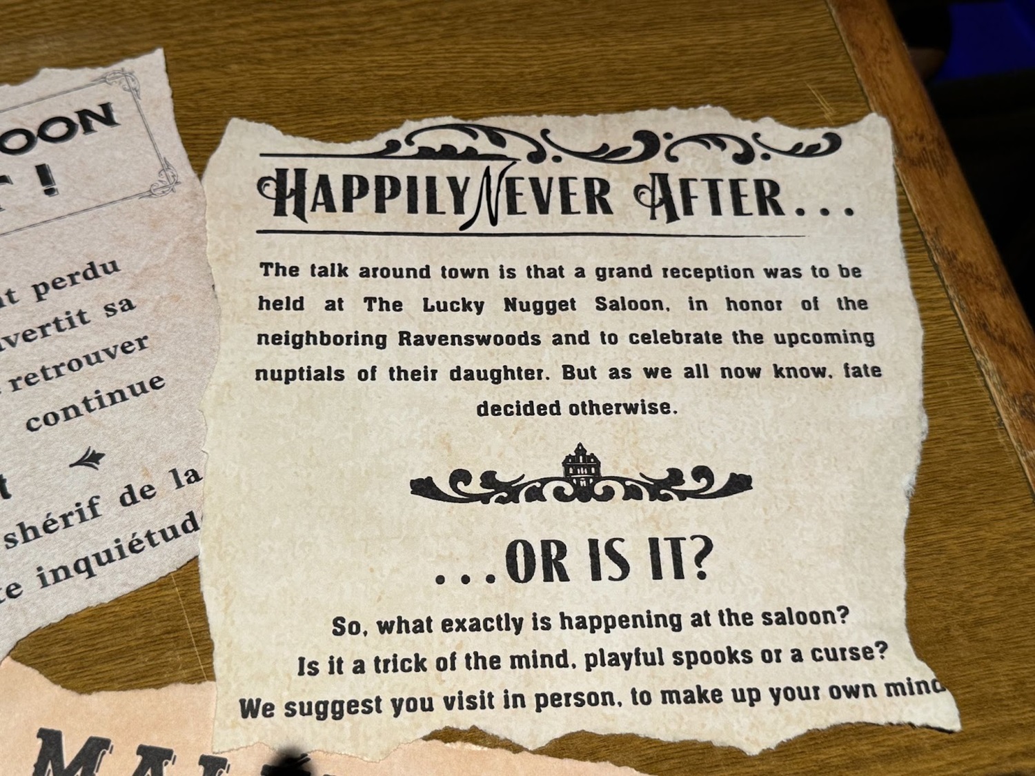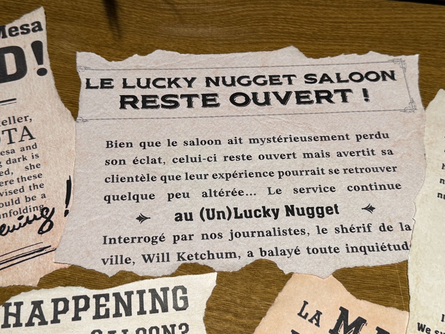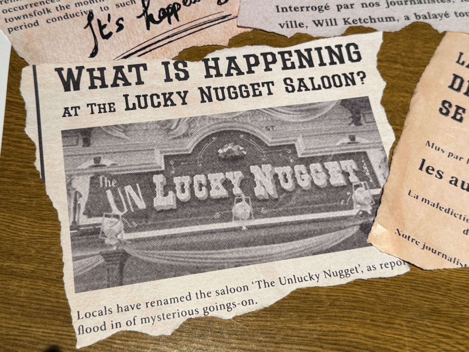 Guests' tables have been decorated with various news clippings telling the story of what happened to the Unlucky Nugget Saloon.