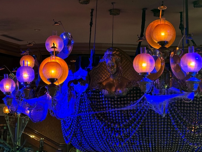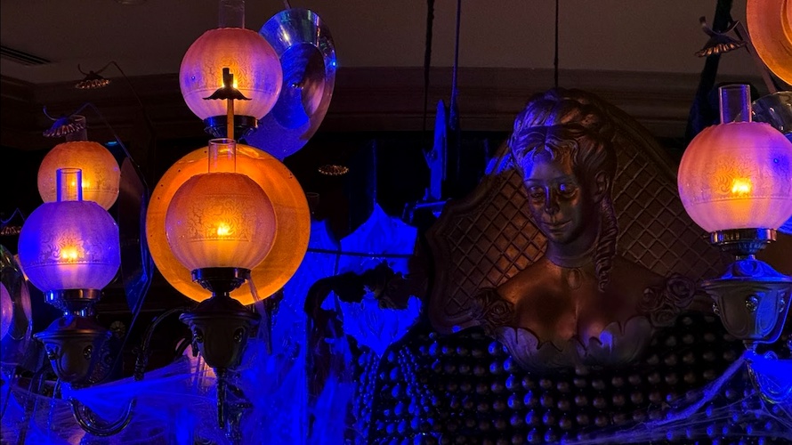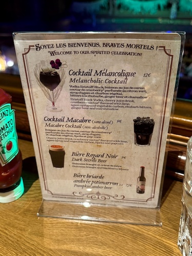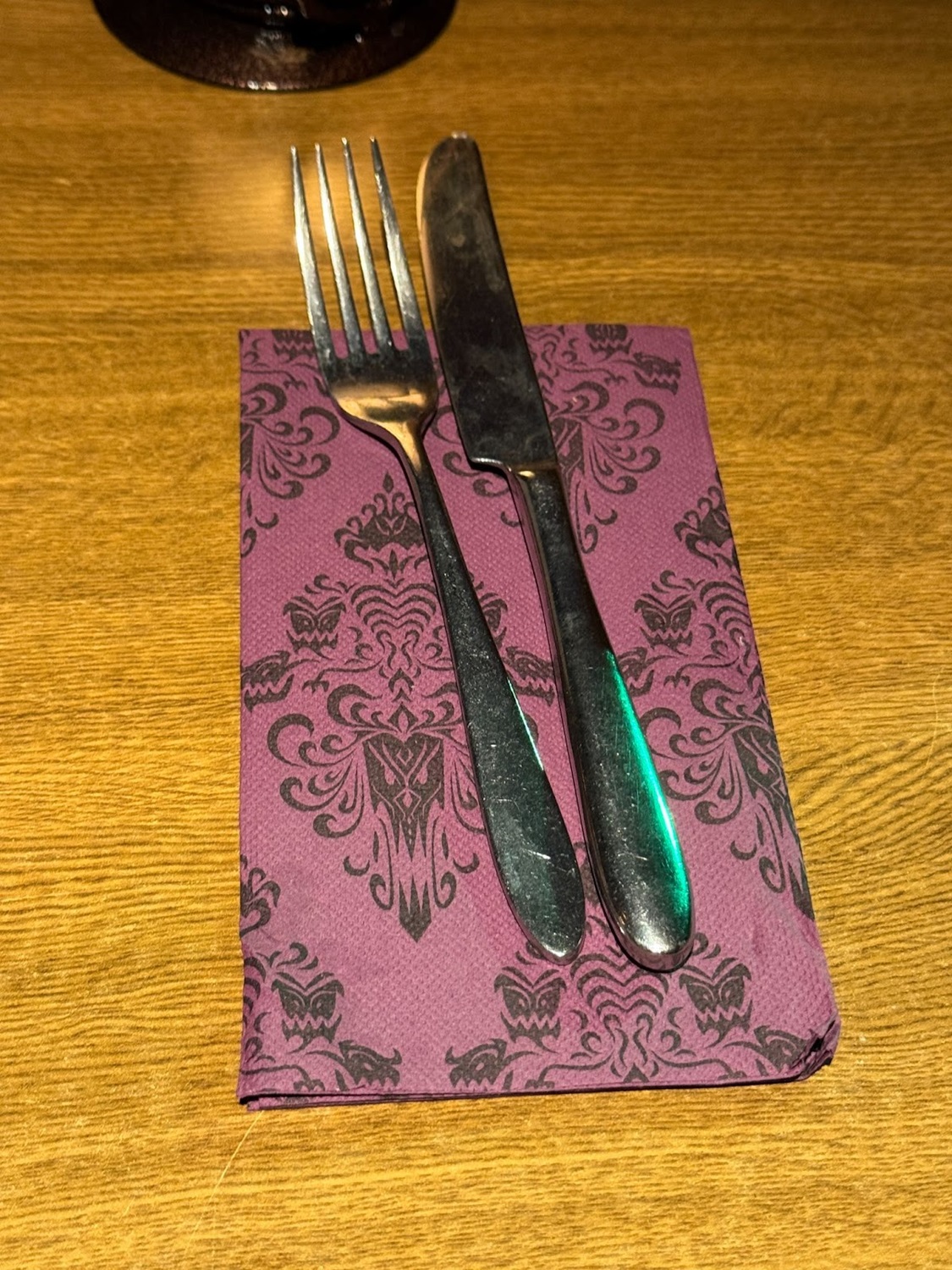 Even the silverware gets a spooky touch, with napkins featuring the iconic Phantom Manor/Haunted Mansion wallpaper.