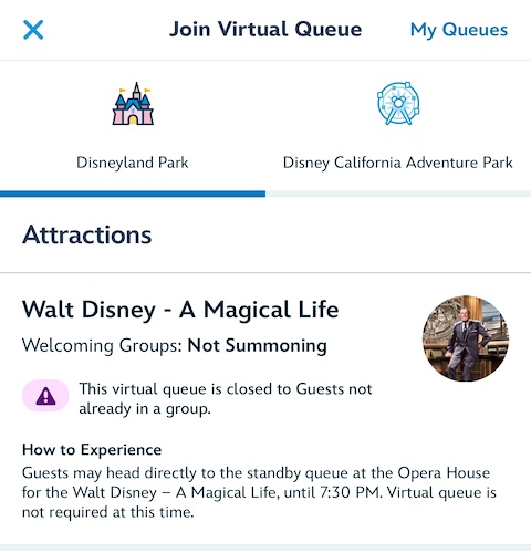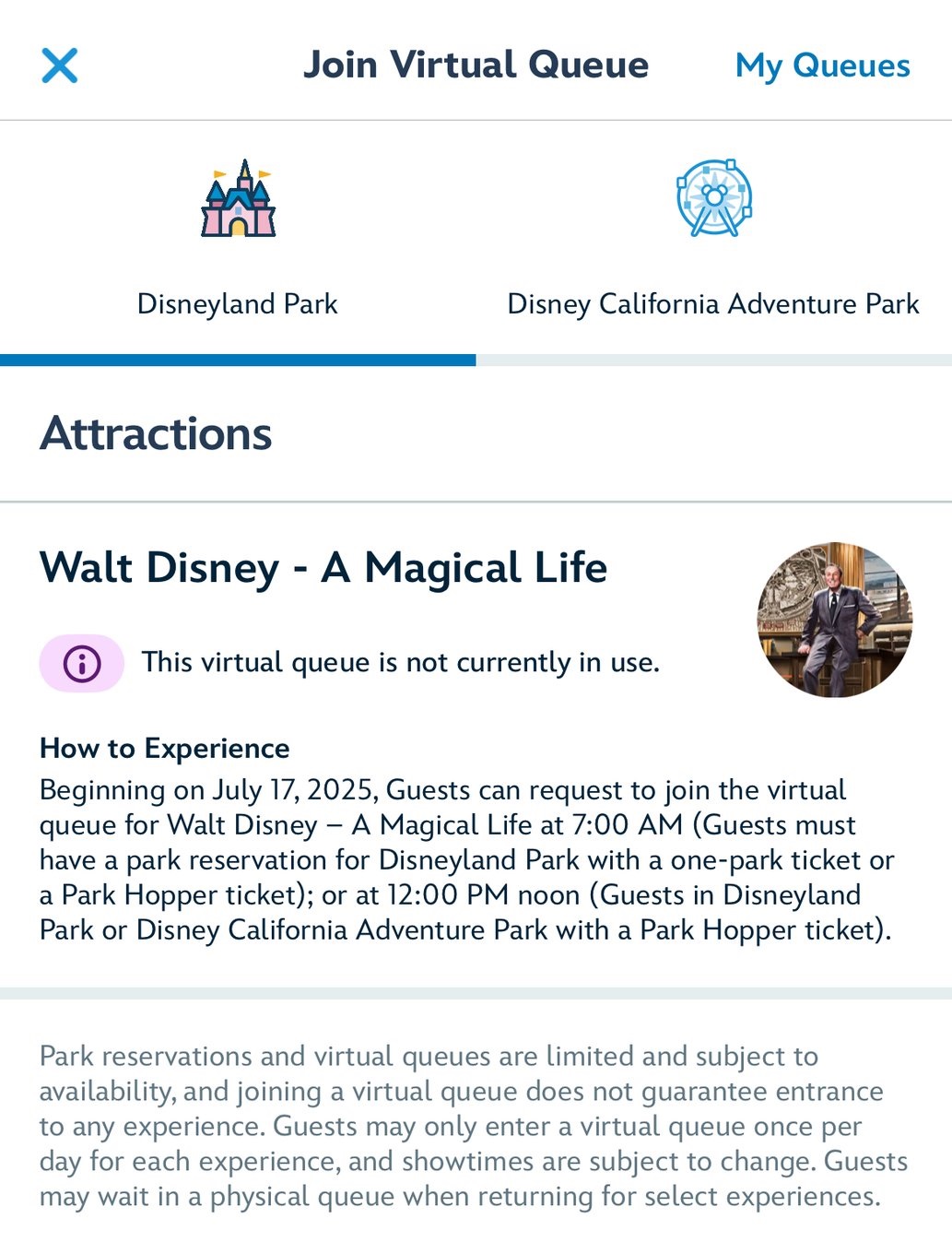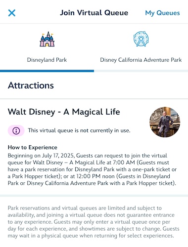 - Walt Disney – A Magical Life, a new show featuring the first-ever Audio-Animatronic figure of Walt himself, will be making use of a Virtual Queue when it debuts at Disneyland on Thursday, July 17th – the park’s 70th birthday.