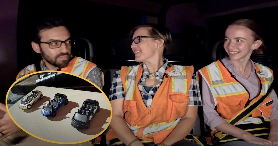 - Mo also points out fun Easter eggs in the garage scene, including miniature scale models of all three versions of the Test Track ride vehicles.