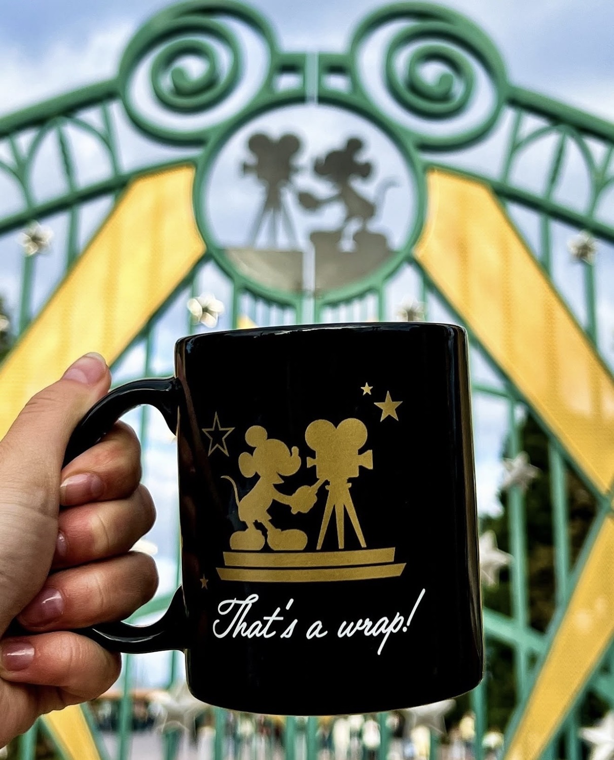 - A mug with Walt Disney Studios logo on one side, and “That’s a wrap!" with a Mickey Mouse silhouette on the other side of the mug.