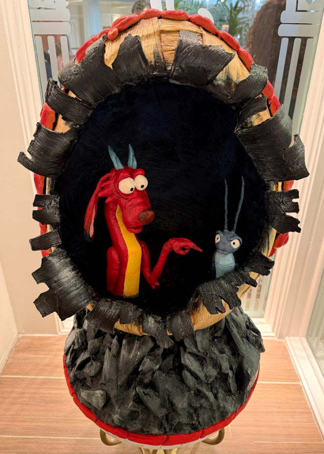 A Mulan egg features the warrior in full armor atop her horse, Khan. The back of the egg appears to have exploded open to reveal Mushu and Cri-kee inside.