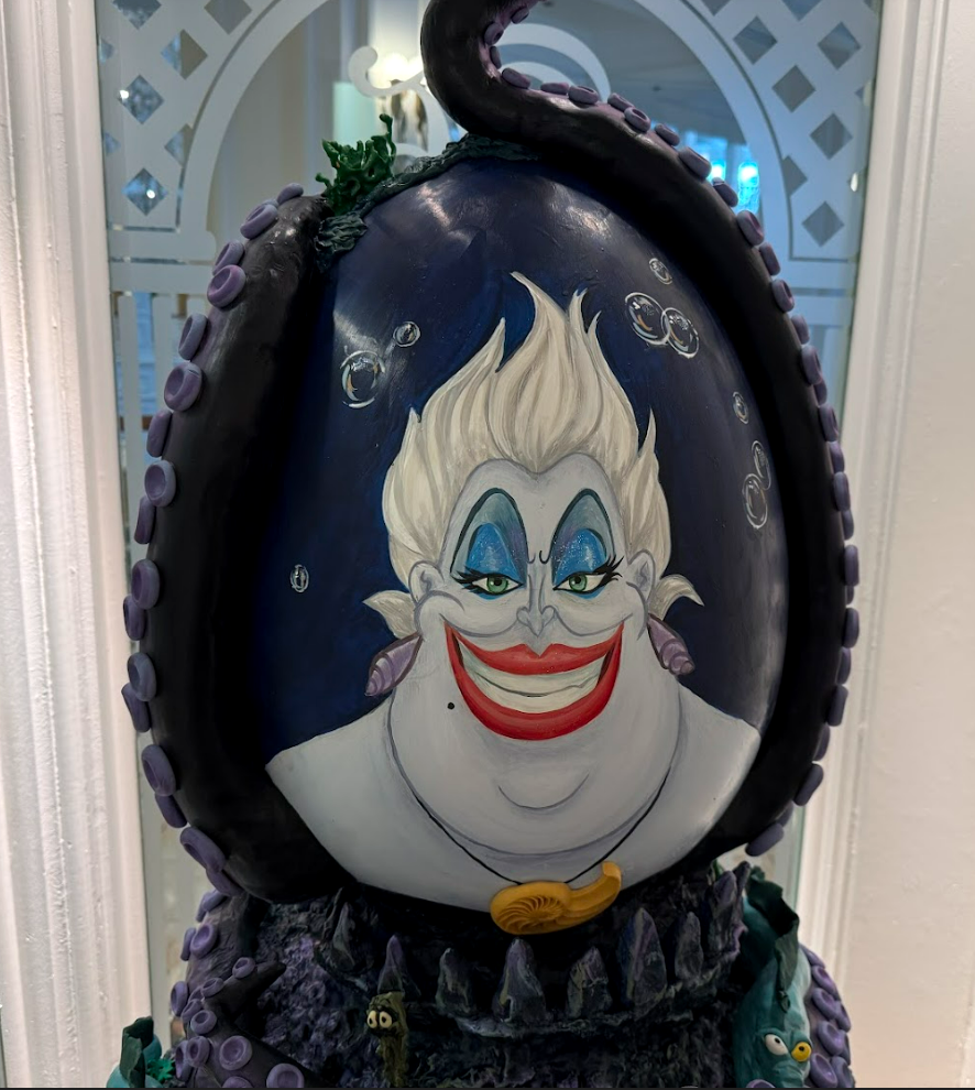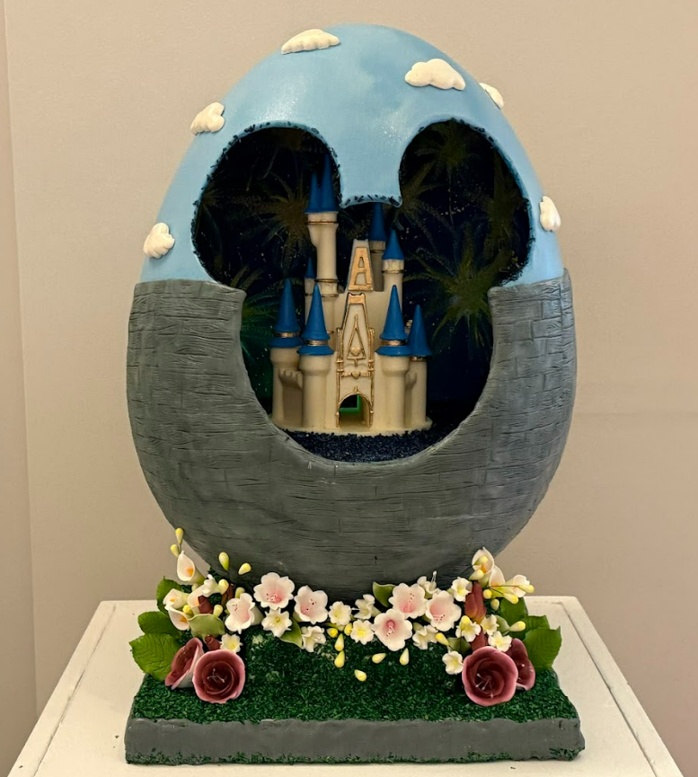 The Little Mermaid egg features a 3D sculpted fondant Ariel sitting on rocks with Flounder and Sebastian. The egg showcases King Triton’s palace on the front and Ursula’s face on the back,