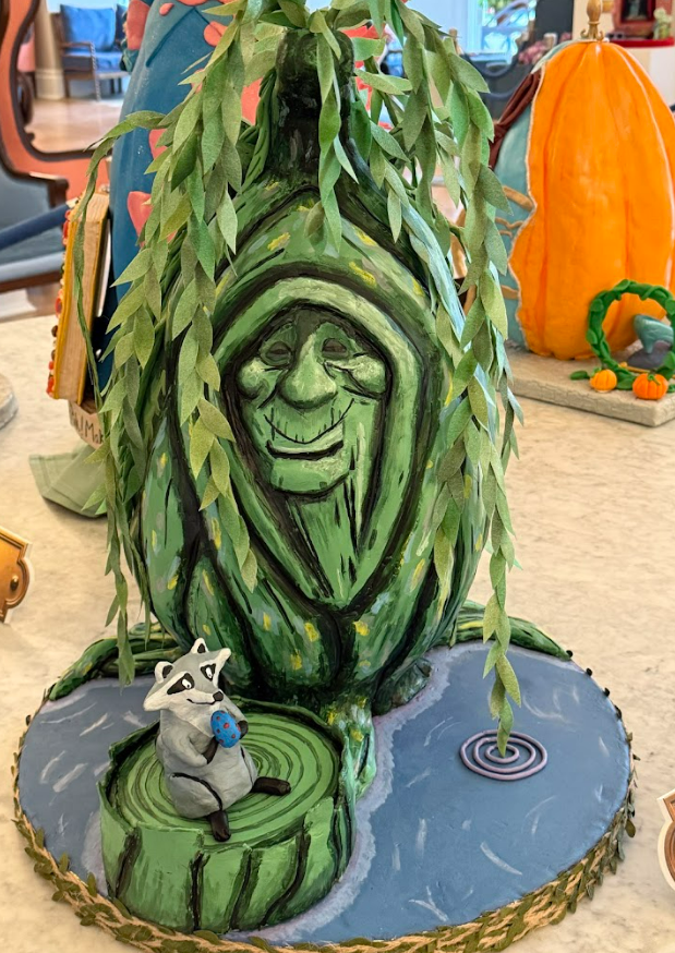 Inspired by Pocahontas, this display features Grandmother Willow shaped as an egg, with Meeko holding a smaller egg on a log base.