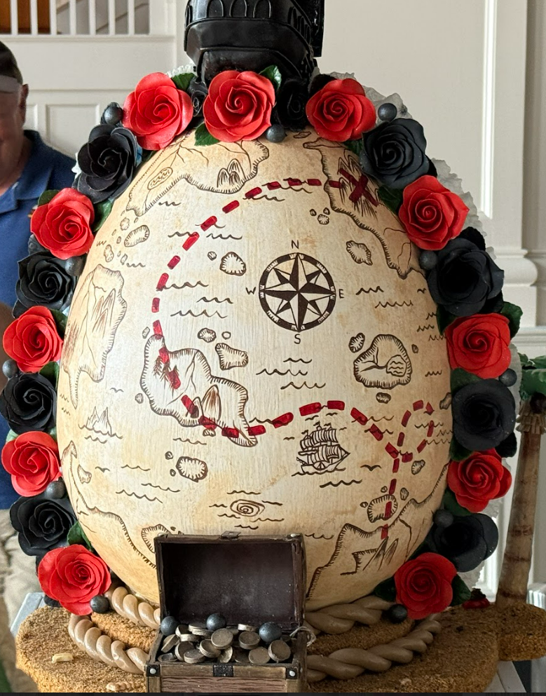 A Pirates of the Caribbean egg resembles a raging waterfall at World's End, with the Black Pearl sailing precariously on top. The back features a treasure map.