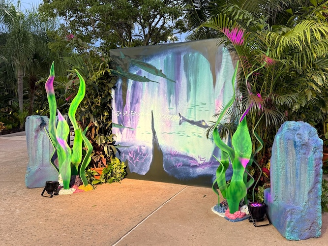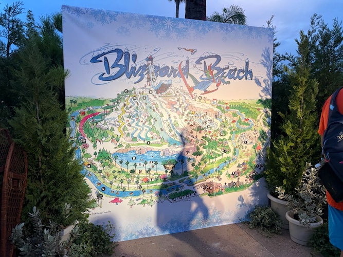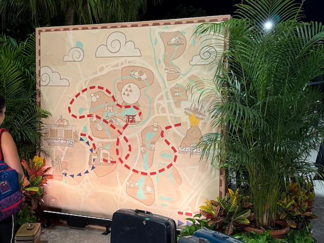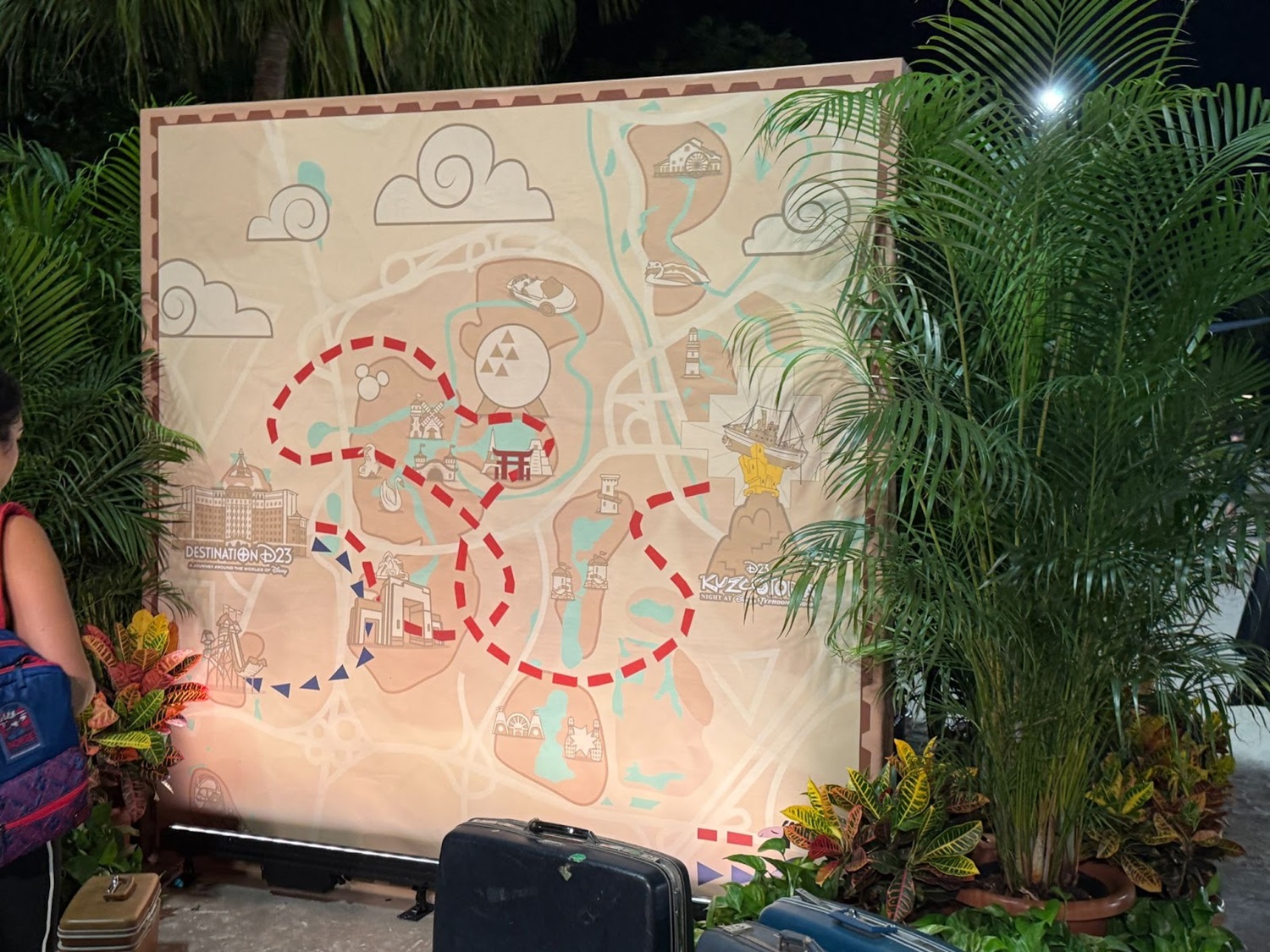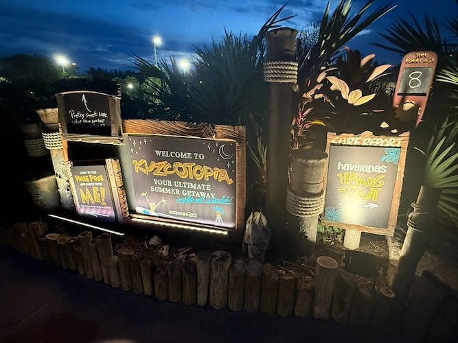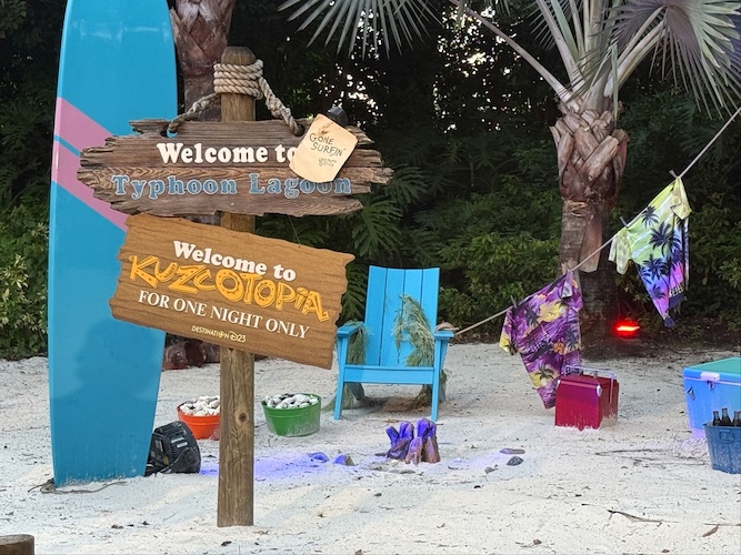 Obviously, tonight’s main attraction was some Emperor’s New Groove fun! Upon entering the water park, a more appropriately themed photo op awaited guests, featuring a stylized map on how to get from Disney’s Coronado Springs Resort, the Destination D23 headquarters, to the Kuzcotopia takeover of Typhoon Lagoon. There was also some fun temporary signage.