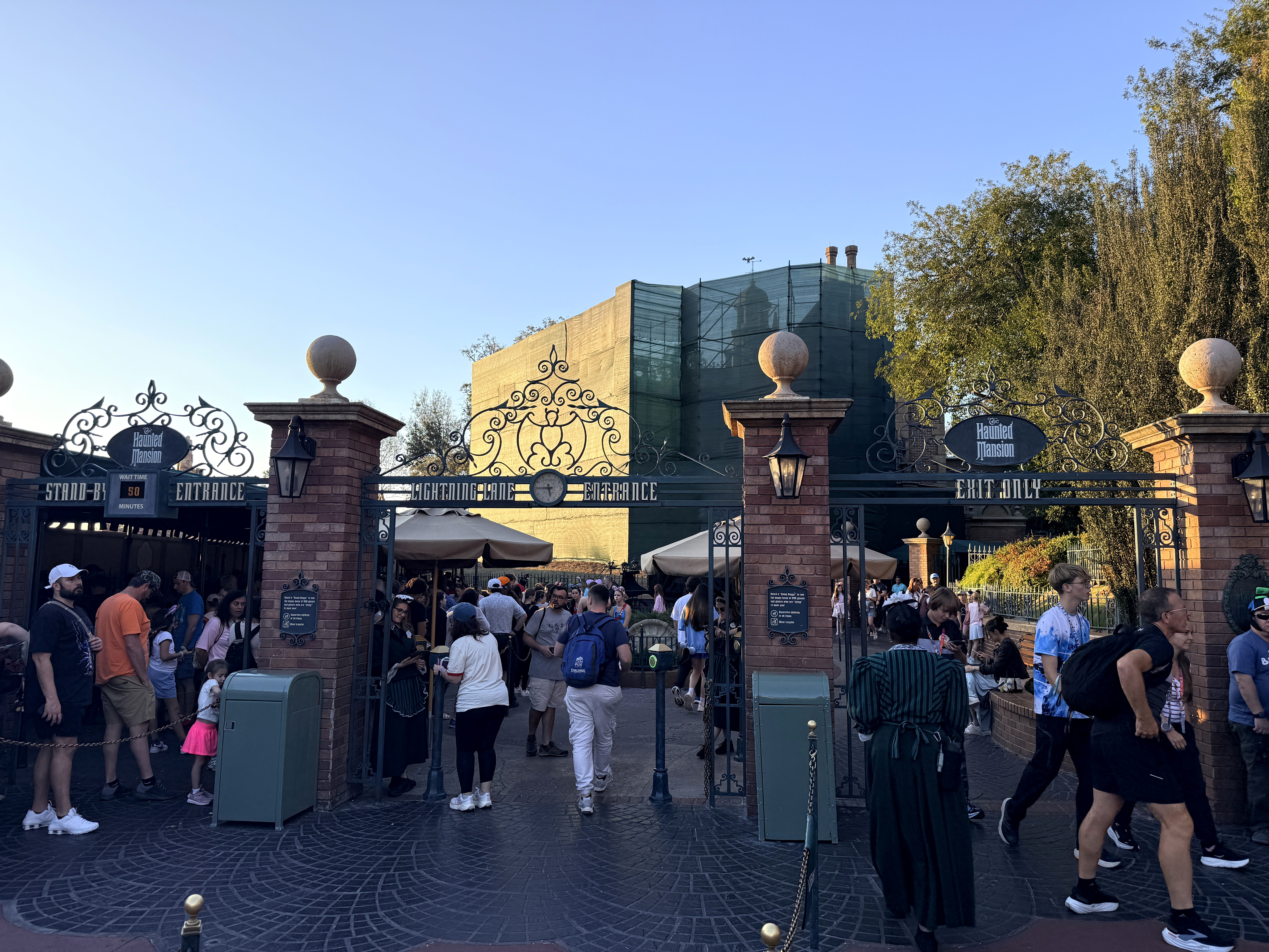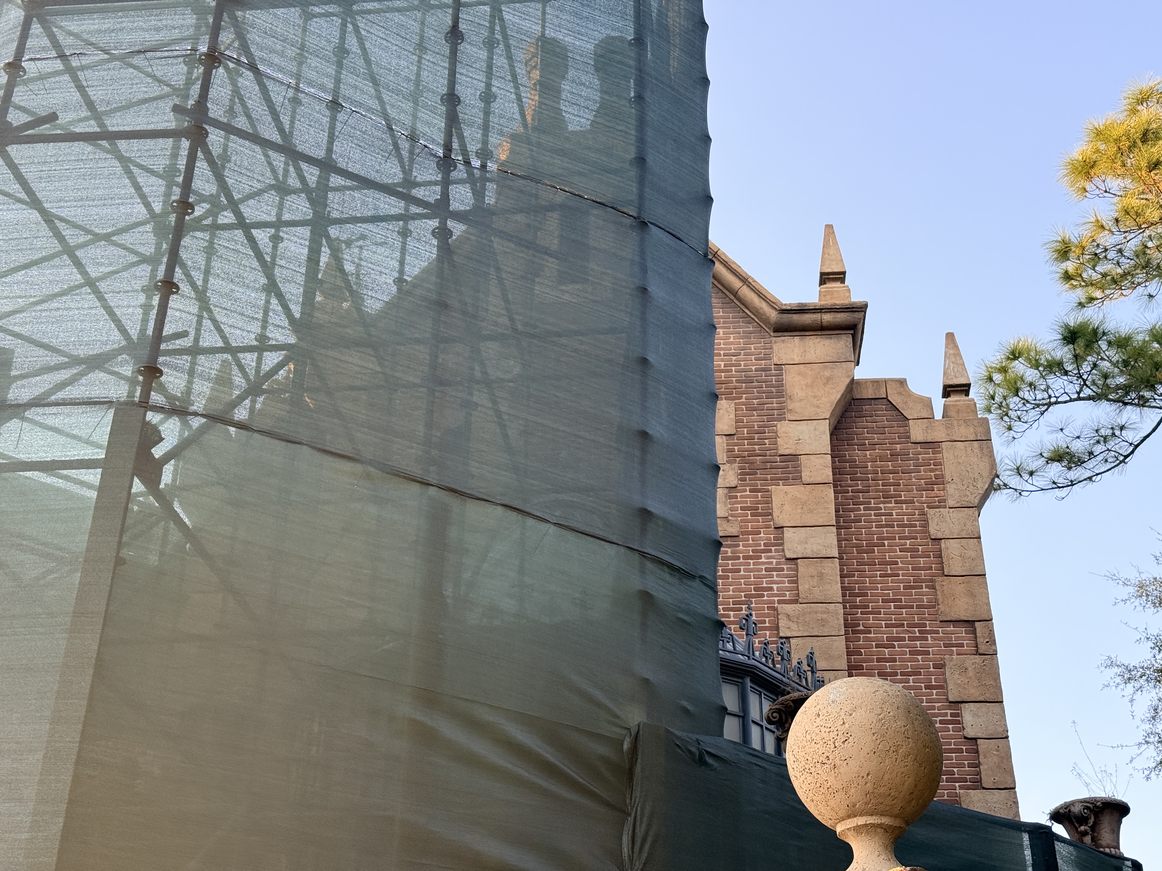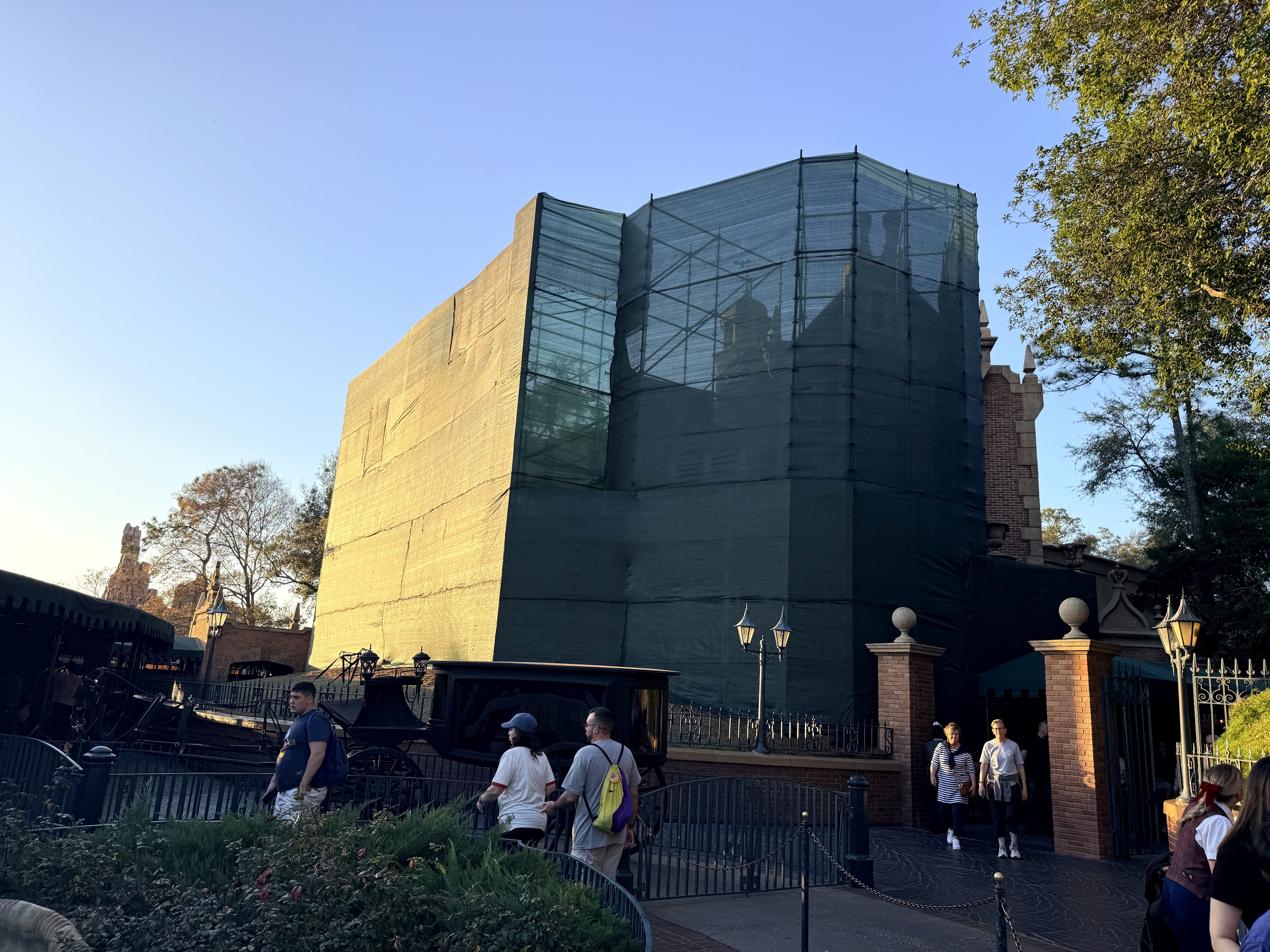 The Haunted Mansion Under Wraps: Iconic Attraction's Facade Covered in Tarps at the Magic Kingdom