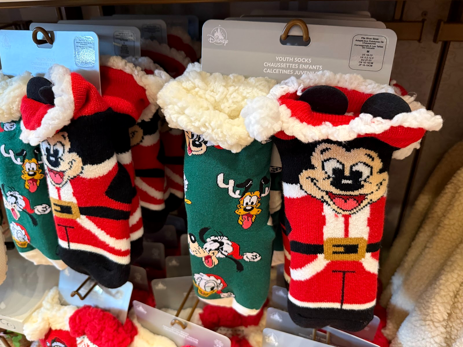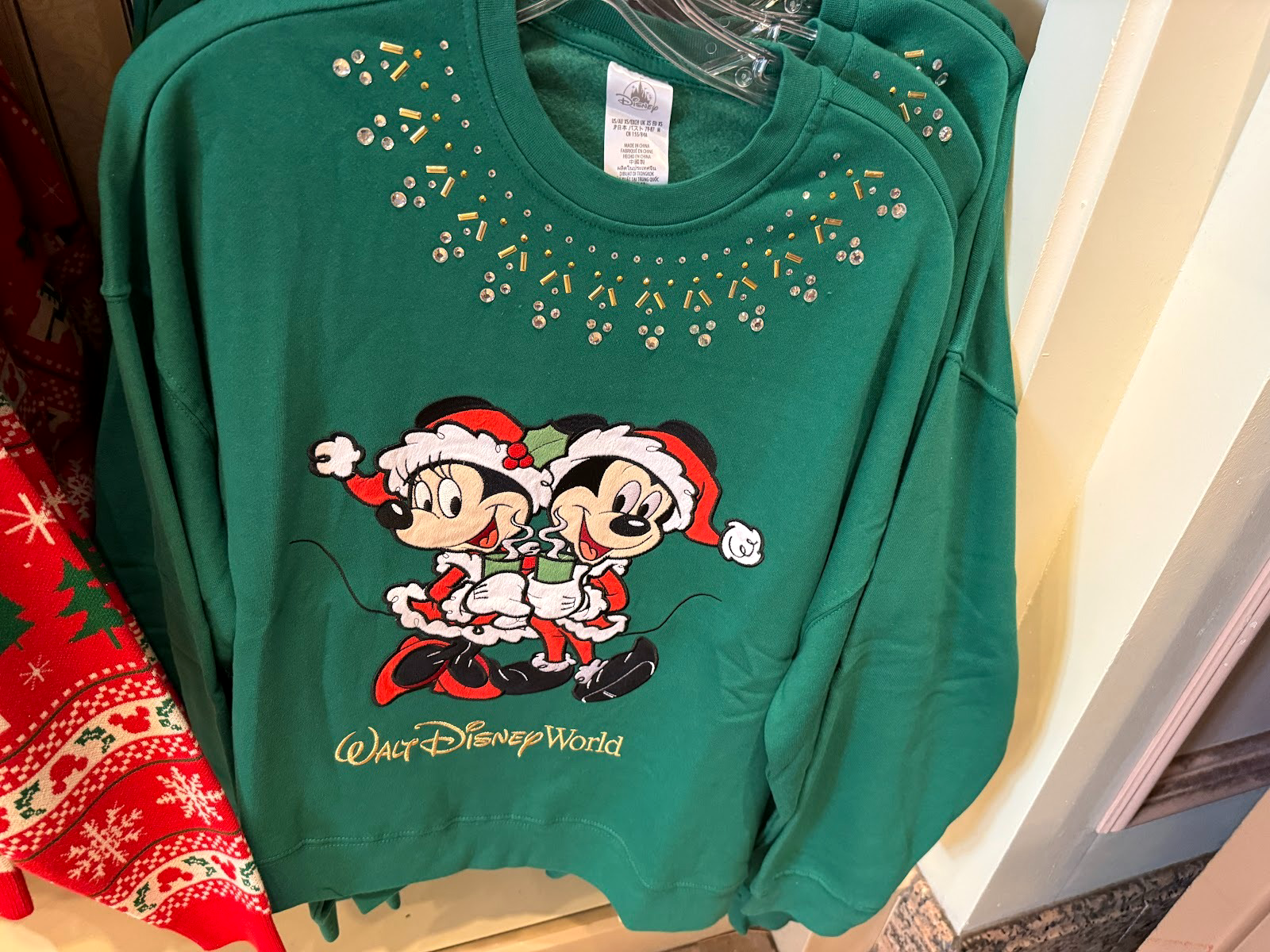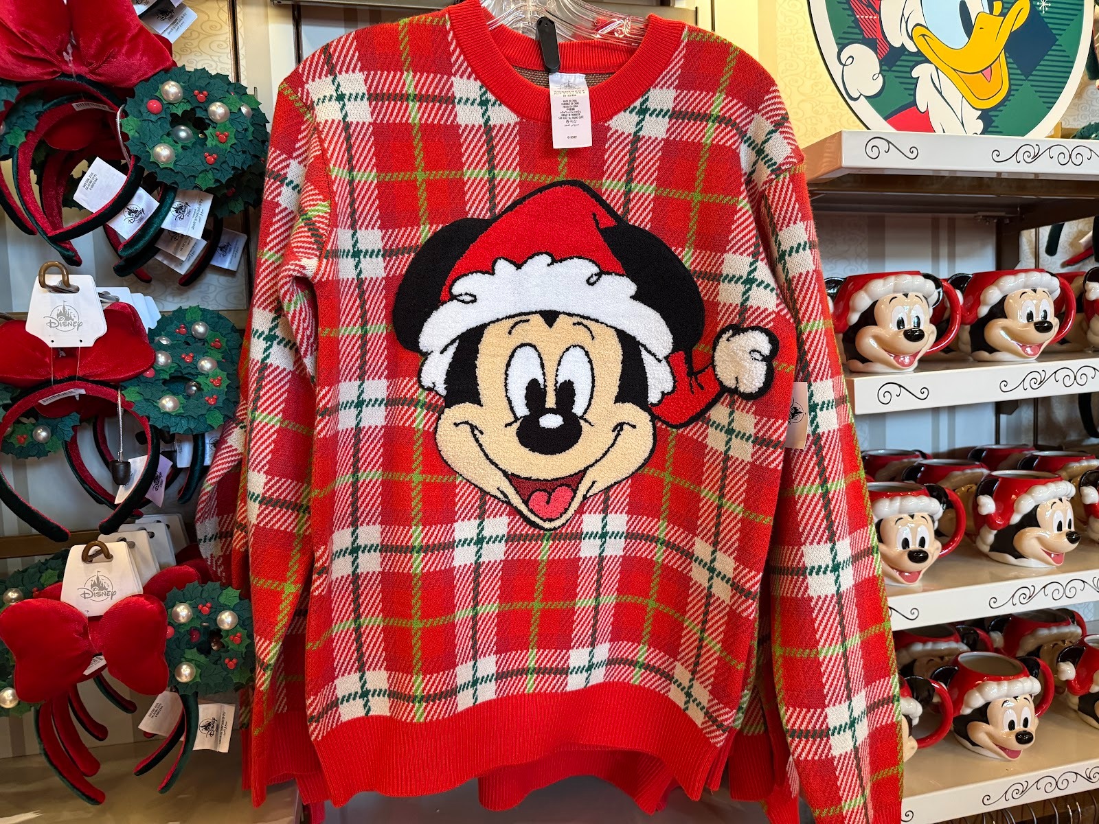 More apparel comes in the form of another pullover sweater, featuring a large Mickey Mouse face wearing a Santa hat against a plaid surface ($79.99) and a similar green one, featuring a pattern around the neckline, and both Mickey and Minnie embroidered on the front. No plaid, though. ($69.99)