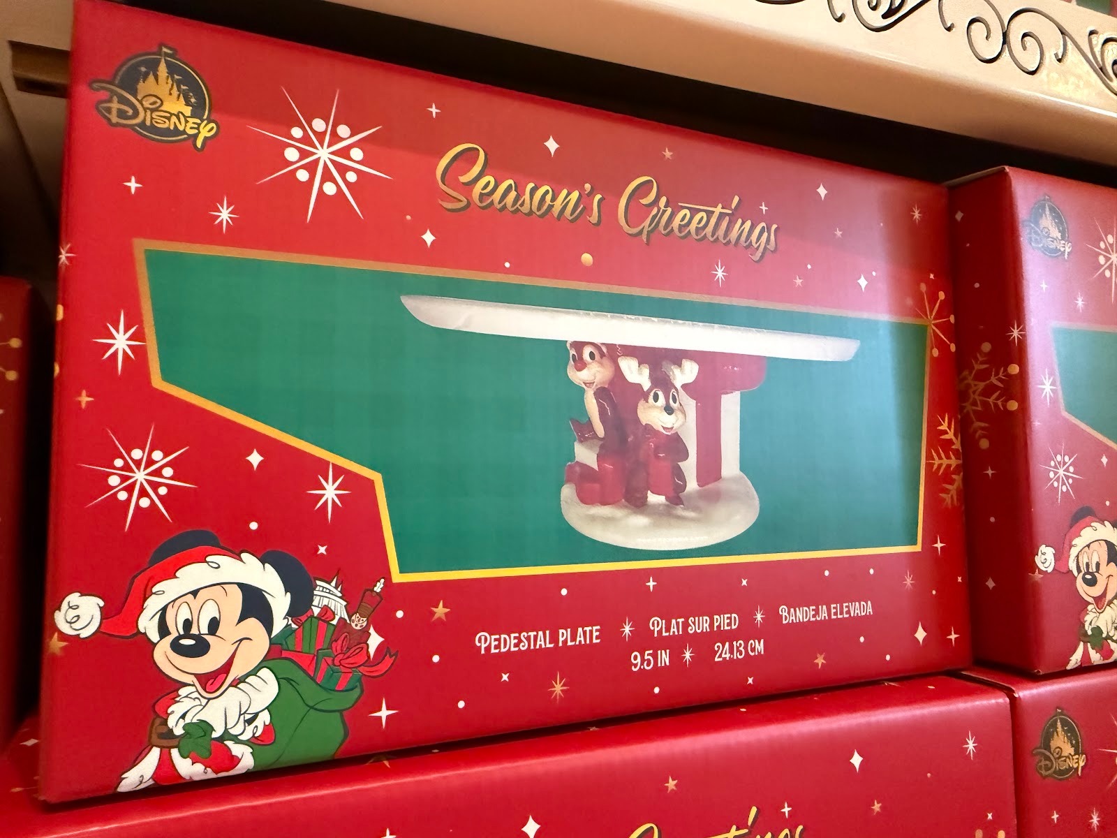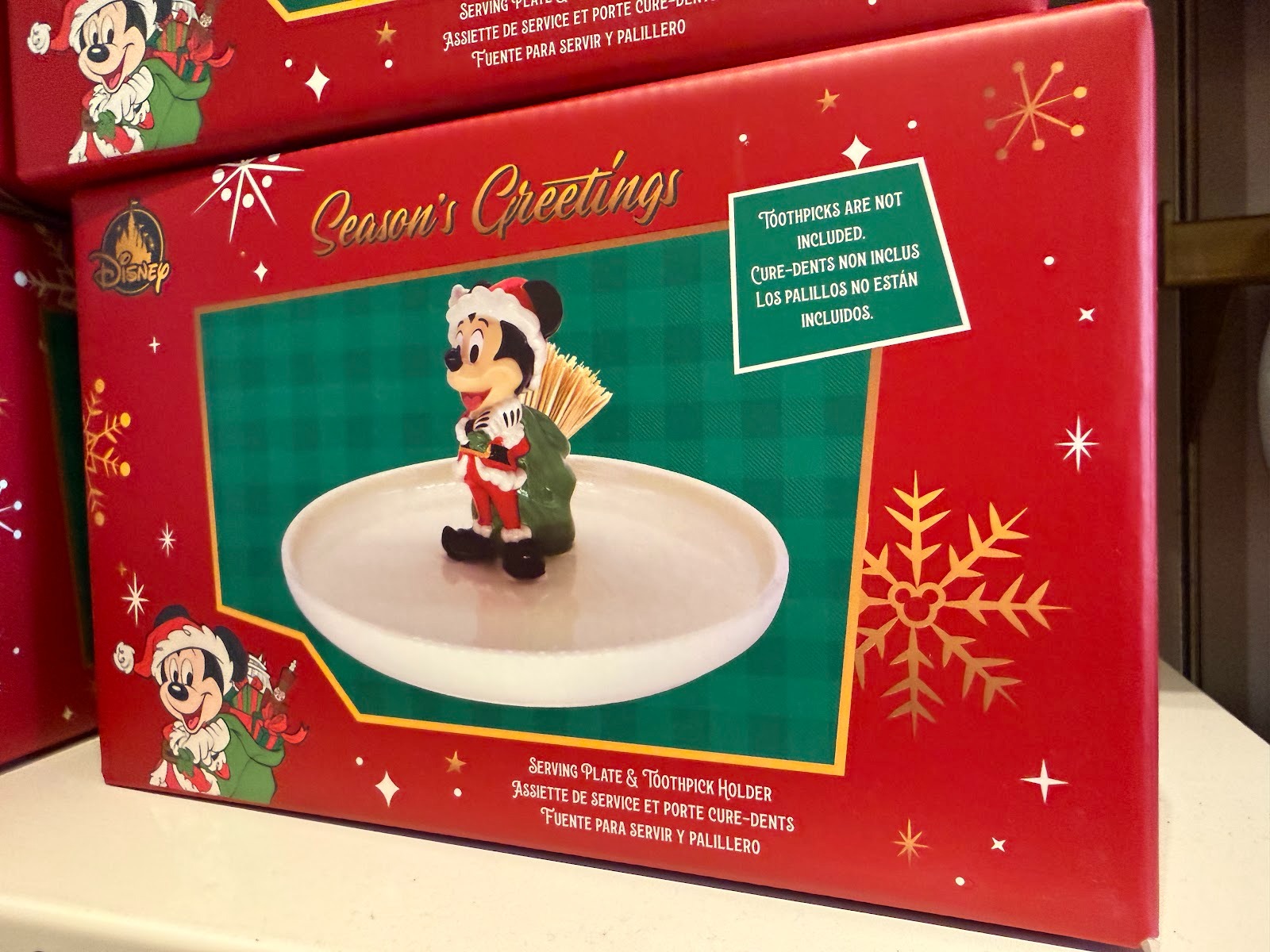A nearby serving plate with Mickey Mouse toothpick holder (legit toothpick holder, not a “toothpick holder” #IYKYK) is available ($39.99) along with even more home goods like a salt and pepper shaker set ($34.99) and Chip & Dale pedestal plate ($49.99).