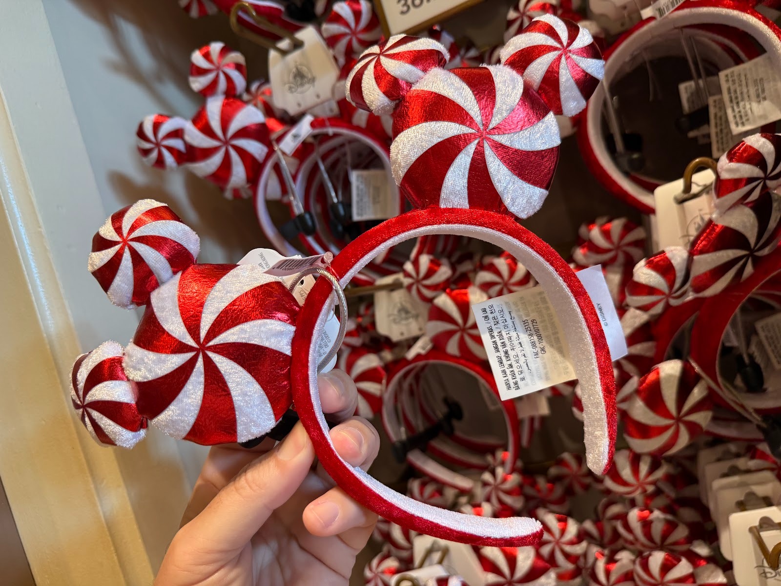 A candy cane look carries over to a set of Mouse Ears on Mouse Ears, giving the ears a peppermint candy kind of look with the candy cane-style striping ($36.99).