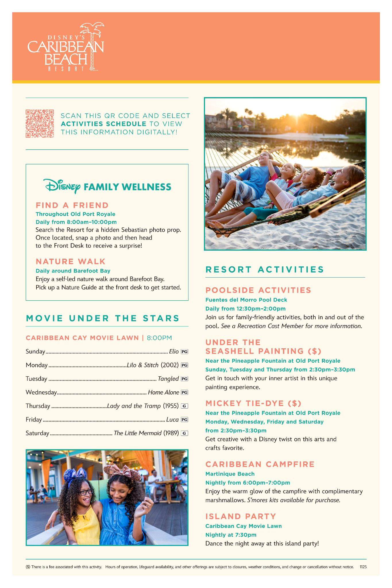 - If you navigate to your select resort, like say, Disney’s Caribbean Beach Resort, you’d head to the Recreation tab. There, you’ll learn about all the amenities and activities offered at your resort, but more importantly - a new selection at the top of the list for “Activities Schedule.”