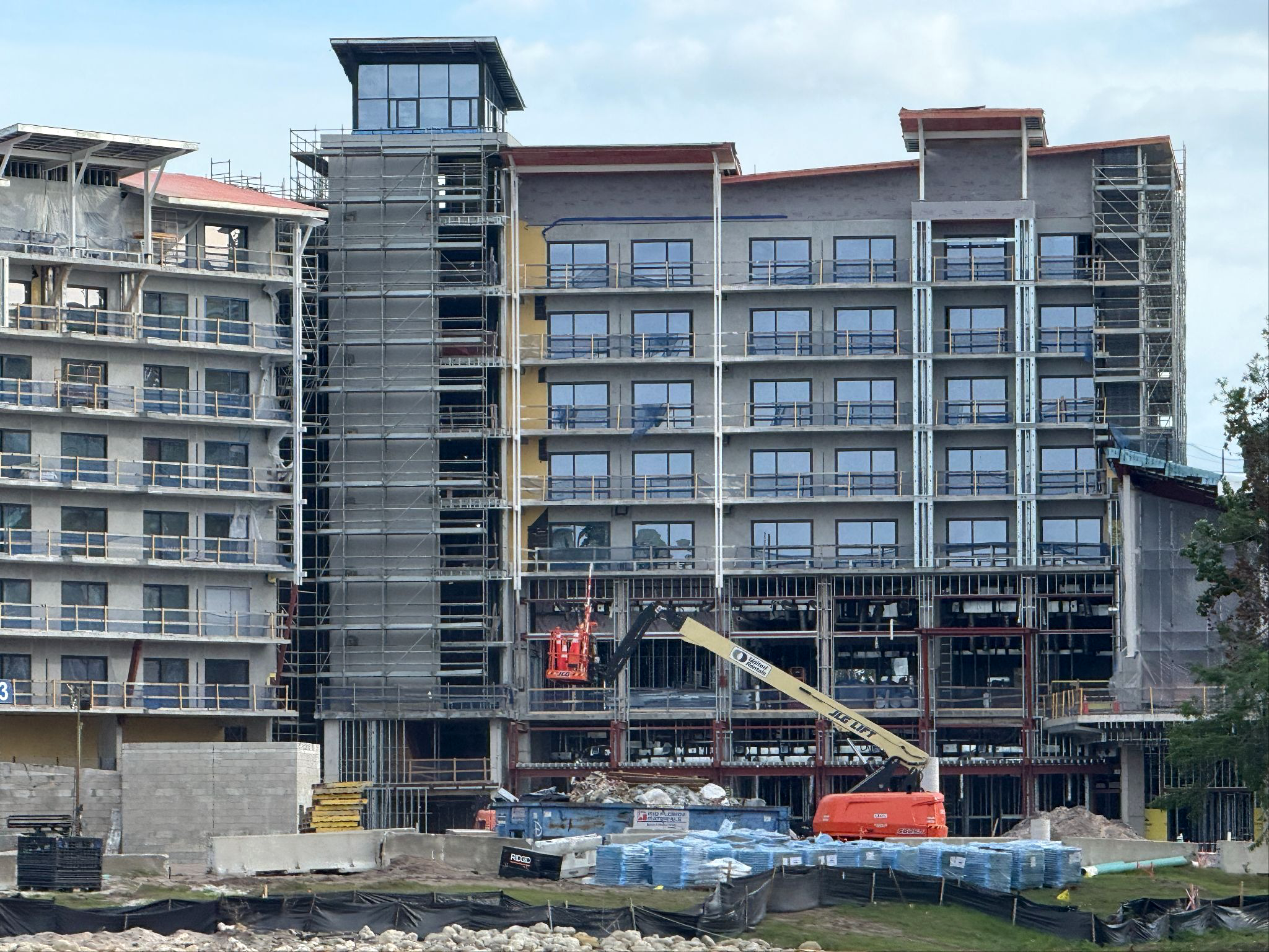 - Towards the backside of the resort, the building isn’t quite as far along. Railings, windows, and exterior finishing has yet to be installed, with temporary coverings and scaffolding decorating most of the structure.
