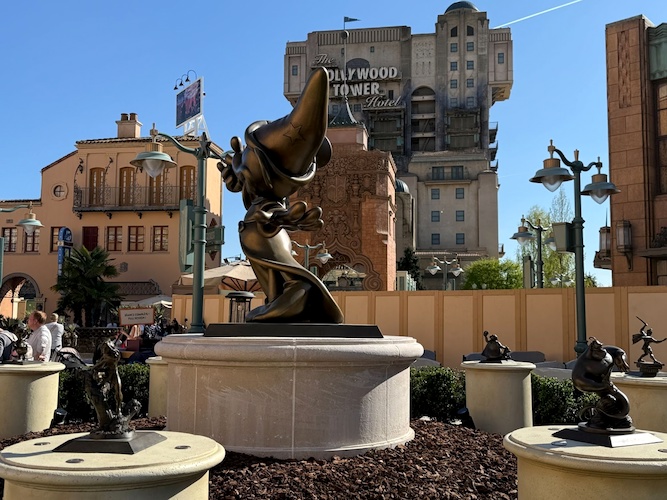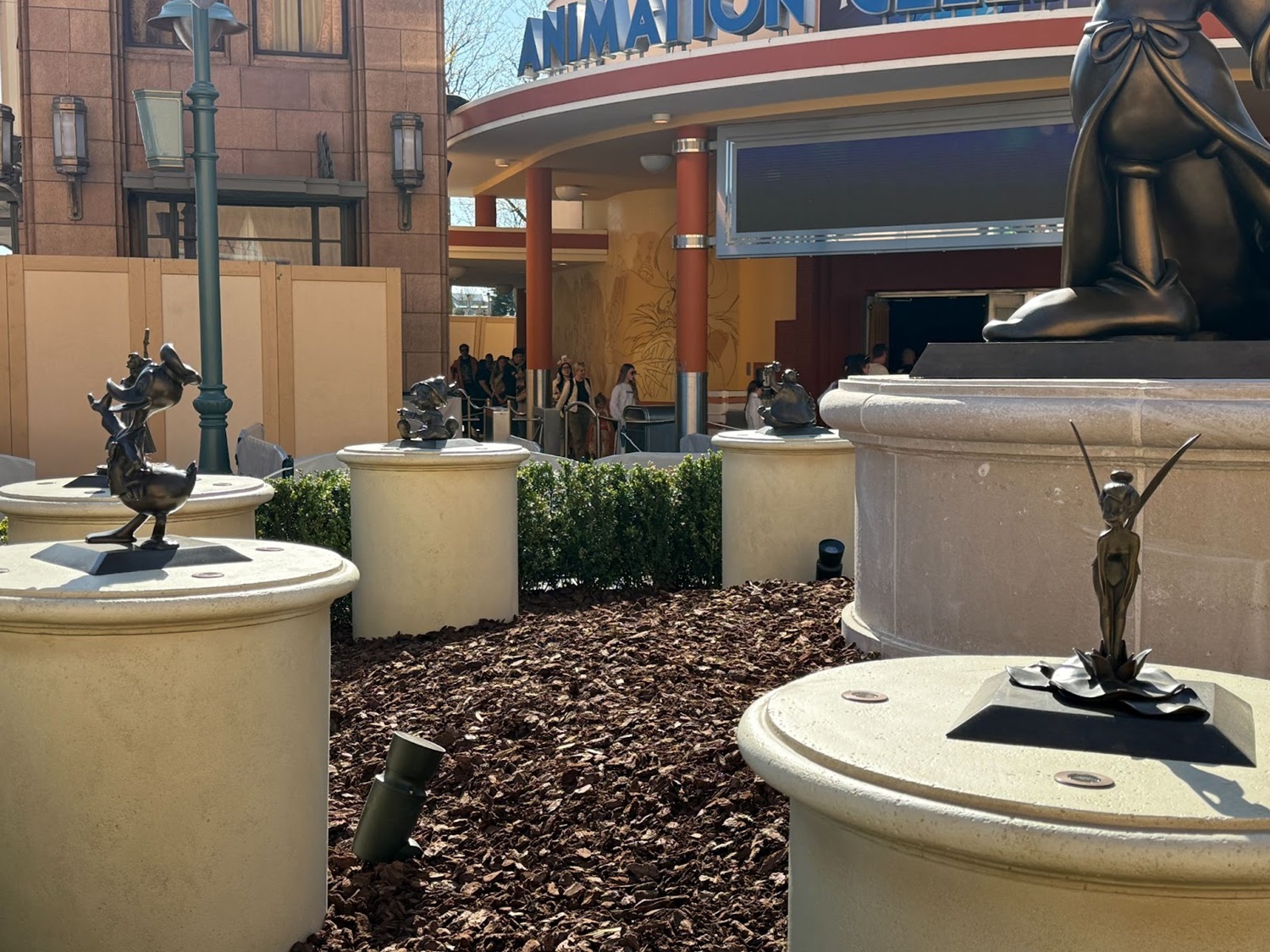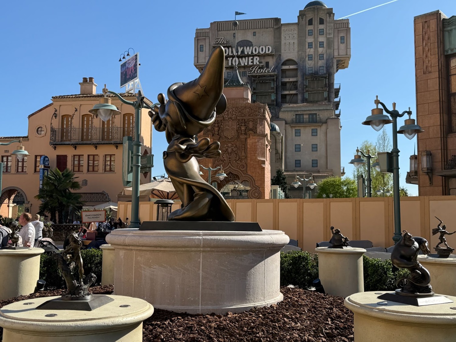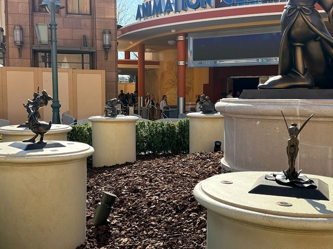 Some walls have come down behind the future World Premiere, revealing a delightfully redesigned Sorcerer Mickey statue, alongside miniature statues of other Disney characters.