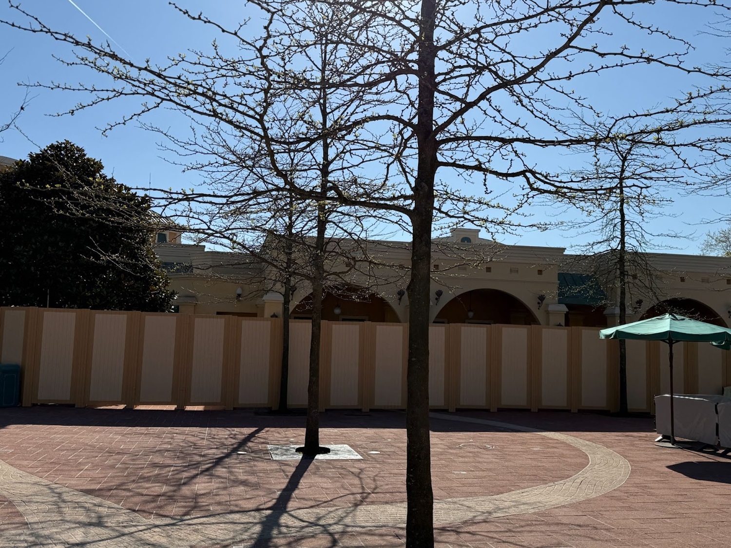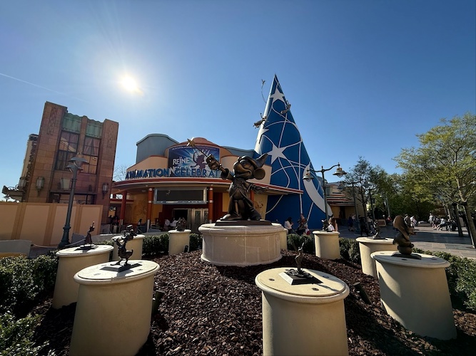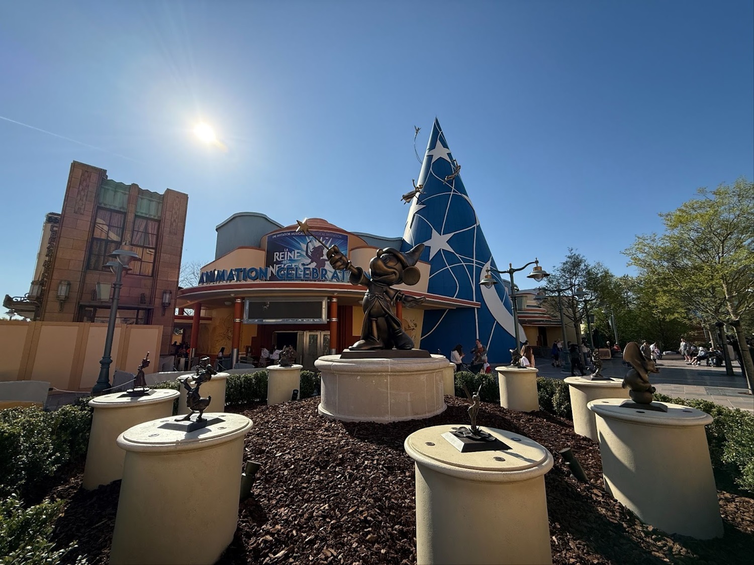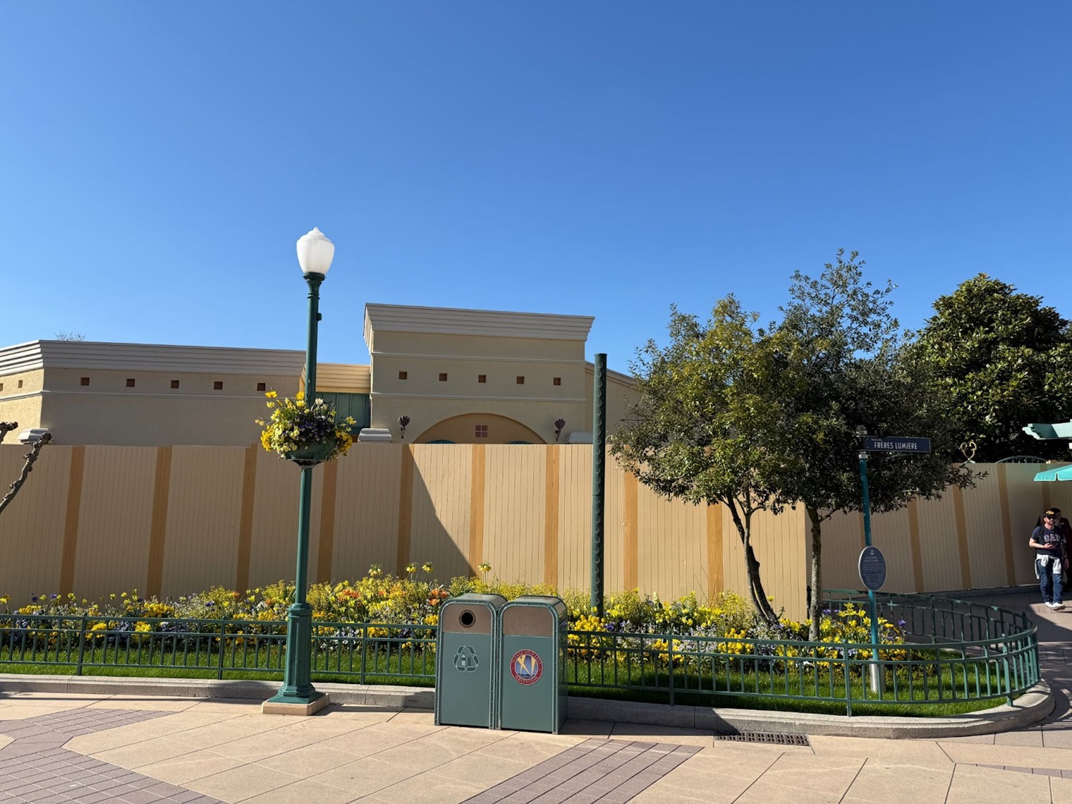 Some walls have come down behind the future World Premiere, revealing a delightfully redesigned Sorcerer Mickey statue, alongside miniature statues of other Disney characters.