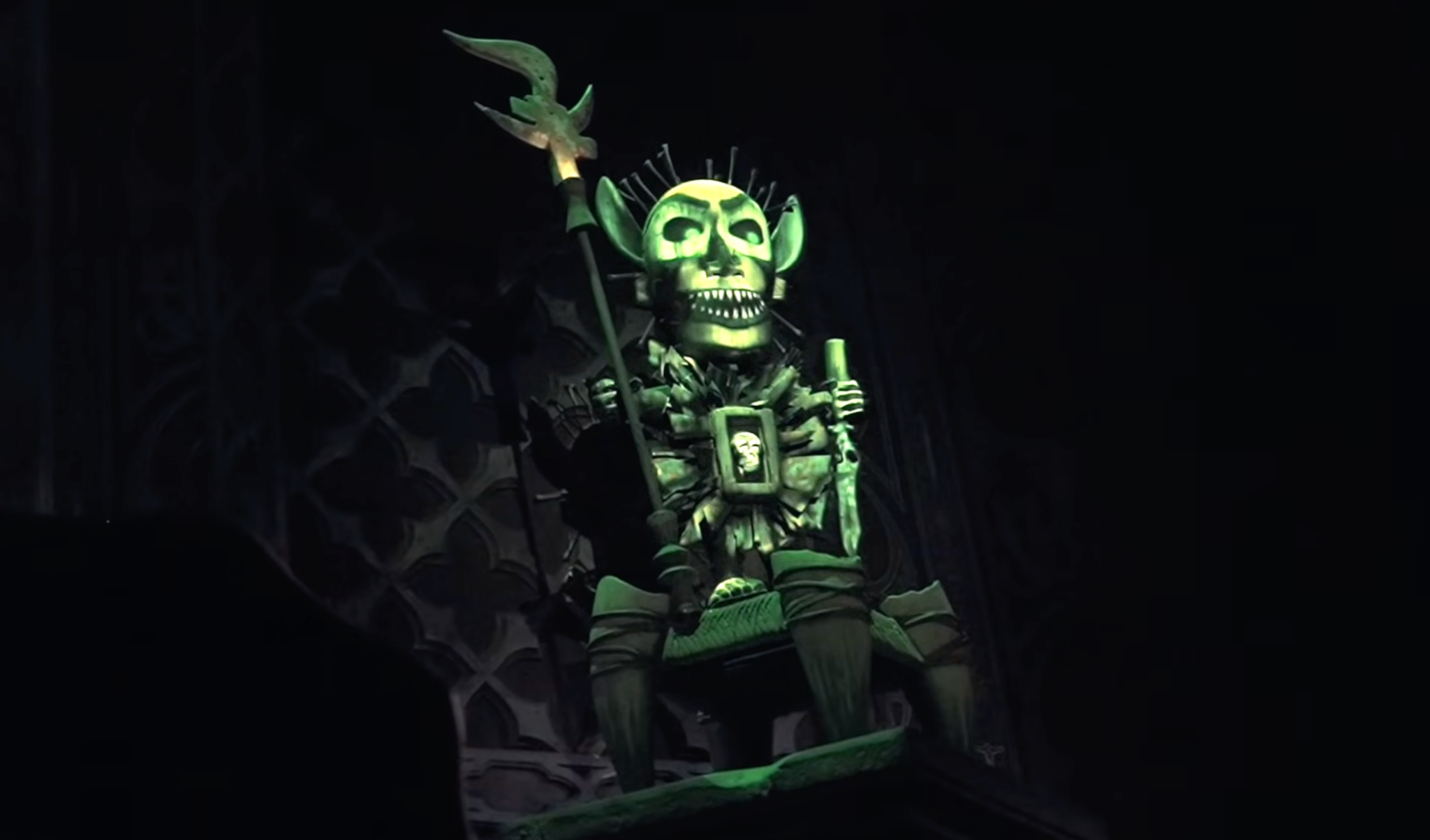 Wally explains in the video that the idol itself is surprisingly simple. It’s a matte black figure with minimal detail, designed specifically to disappear. Using projection mapping, Disney animates the idol’s face, eyes glowing, mouth moving, similar to effects seen in other attractions. But because the surface is so dark, it becomes nearly invisible when the lights drop, enhancing the illusion of a floating, disembodied face.