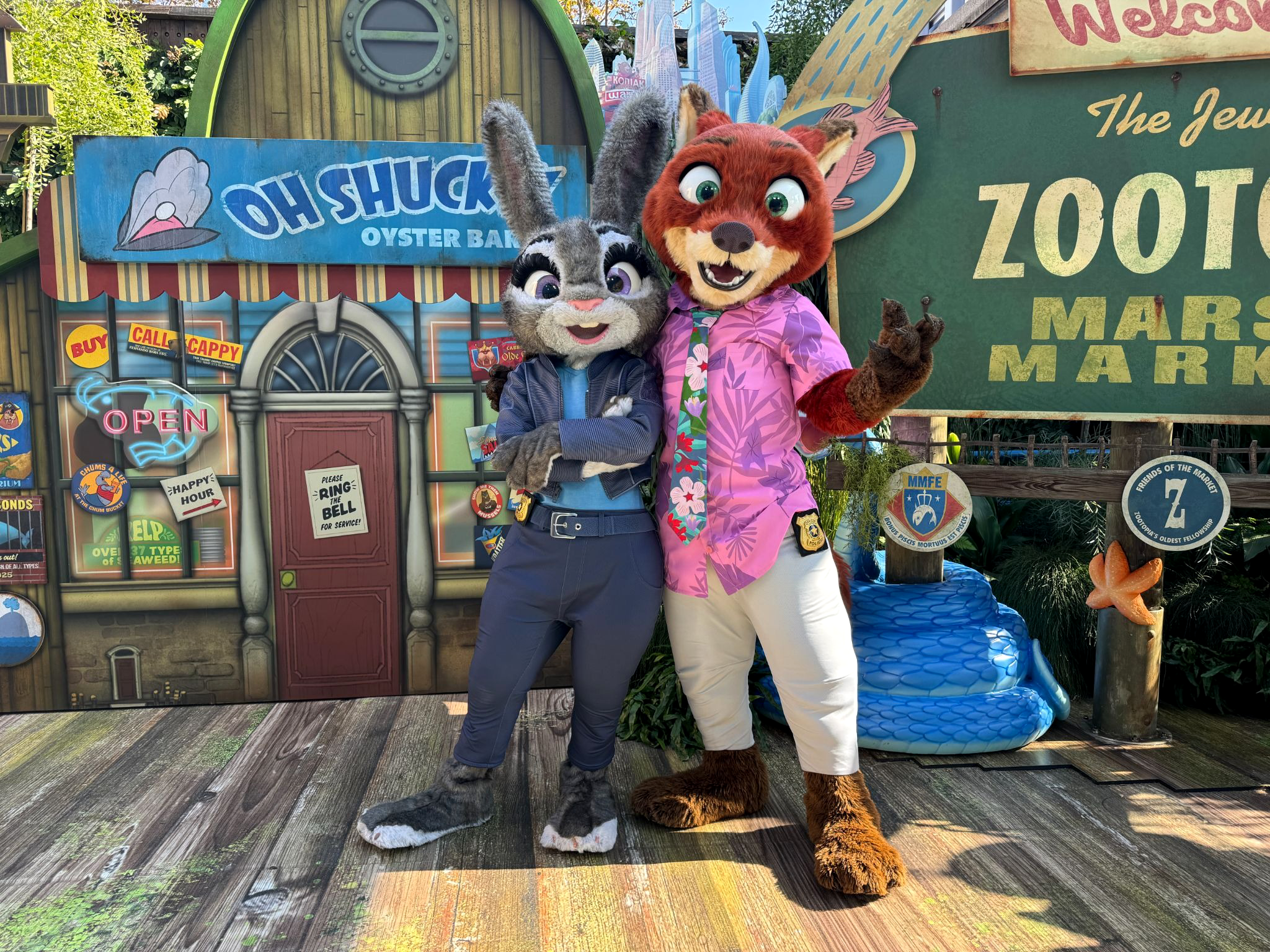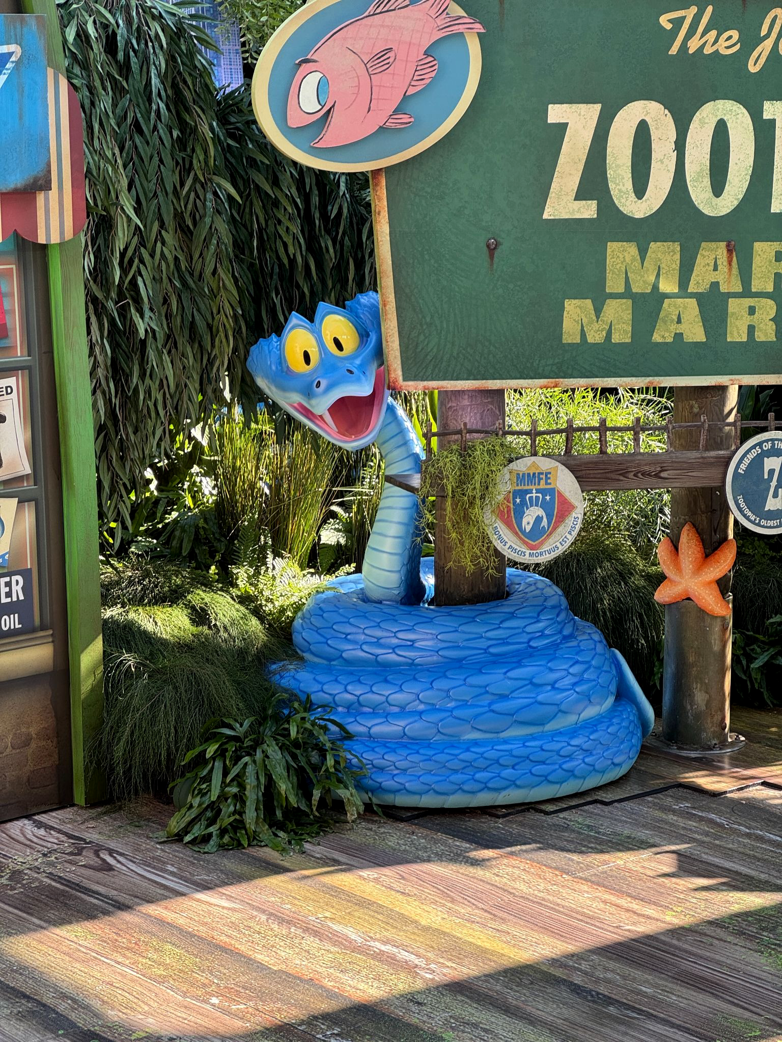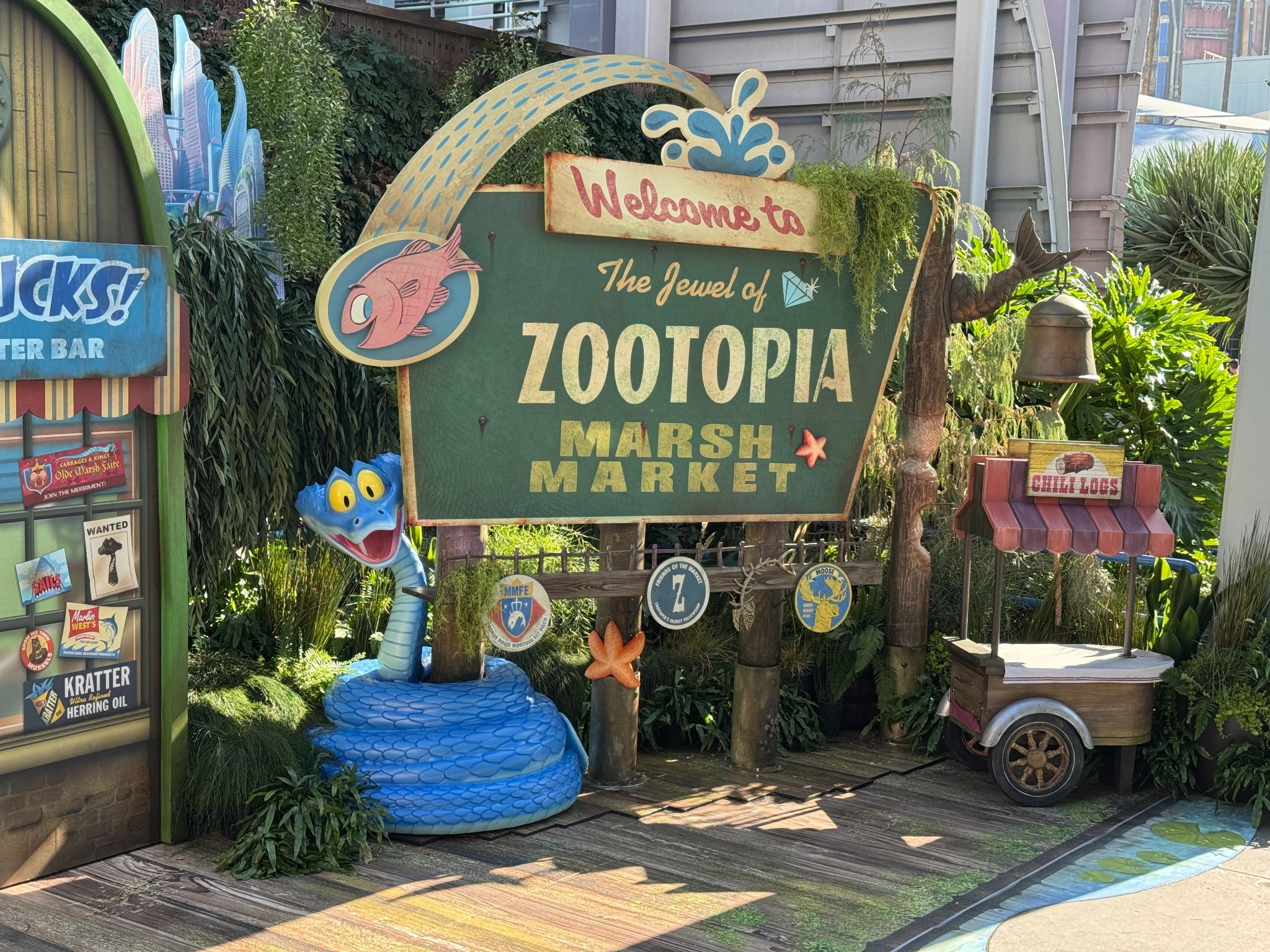 The meet and greet set look slike the facade of the Marsh Market and even features a statue of Gary De’Snake. Formerly, Nick Wilde and Judy Hopps were meeting out on the pathway between Grizzly River Run and Ariel’s Undersea Adventure, so it’s nice to see them meet in their very own themed area.