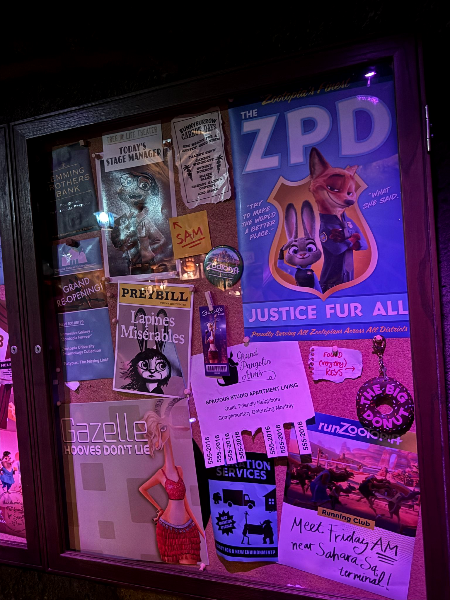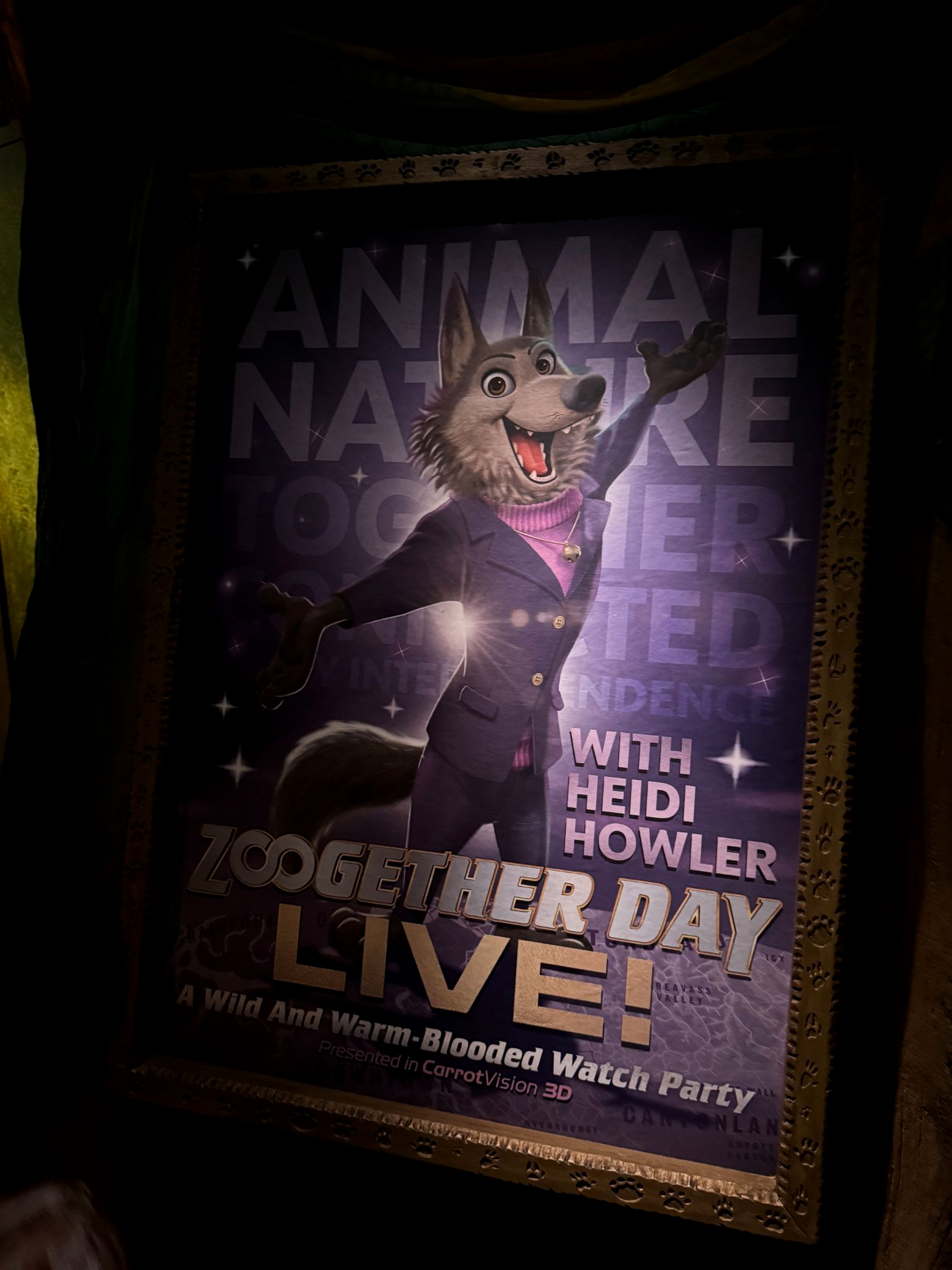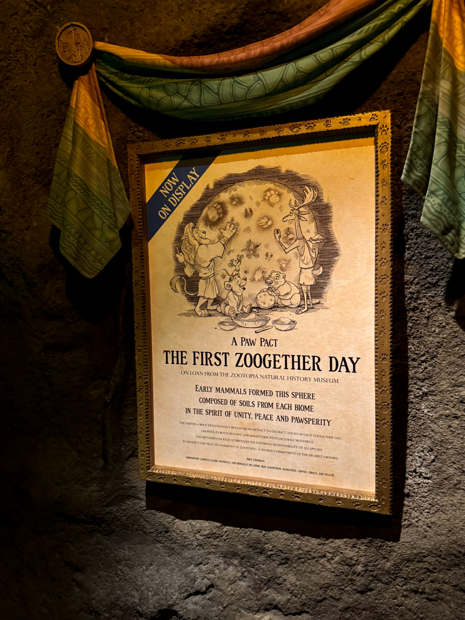 - Once entering the inside portion of the queue, there are even more details inviting guests into the Zoogether Day festivities, including more posters, bulletin boards, artifacts, a Pawdora jewelry display, and a tiny entrance to the theater for Zootopia’s smaller residents.