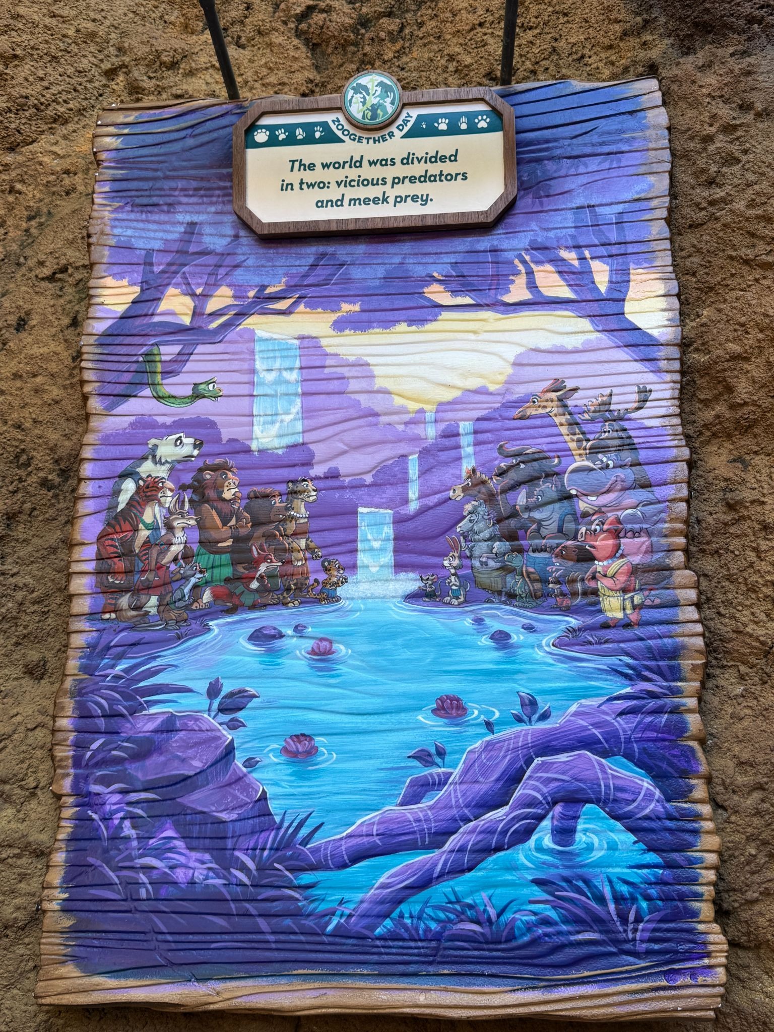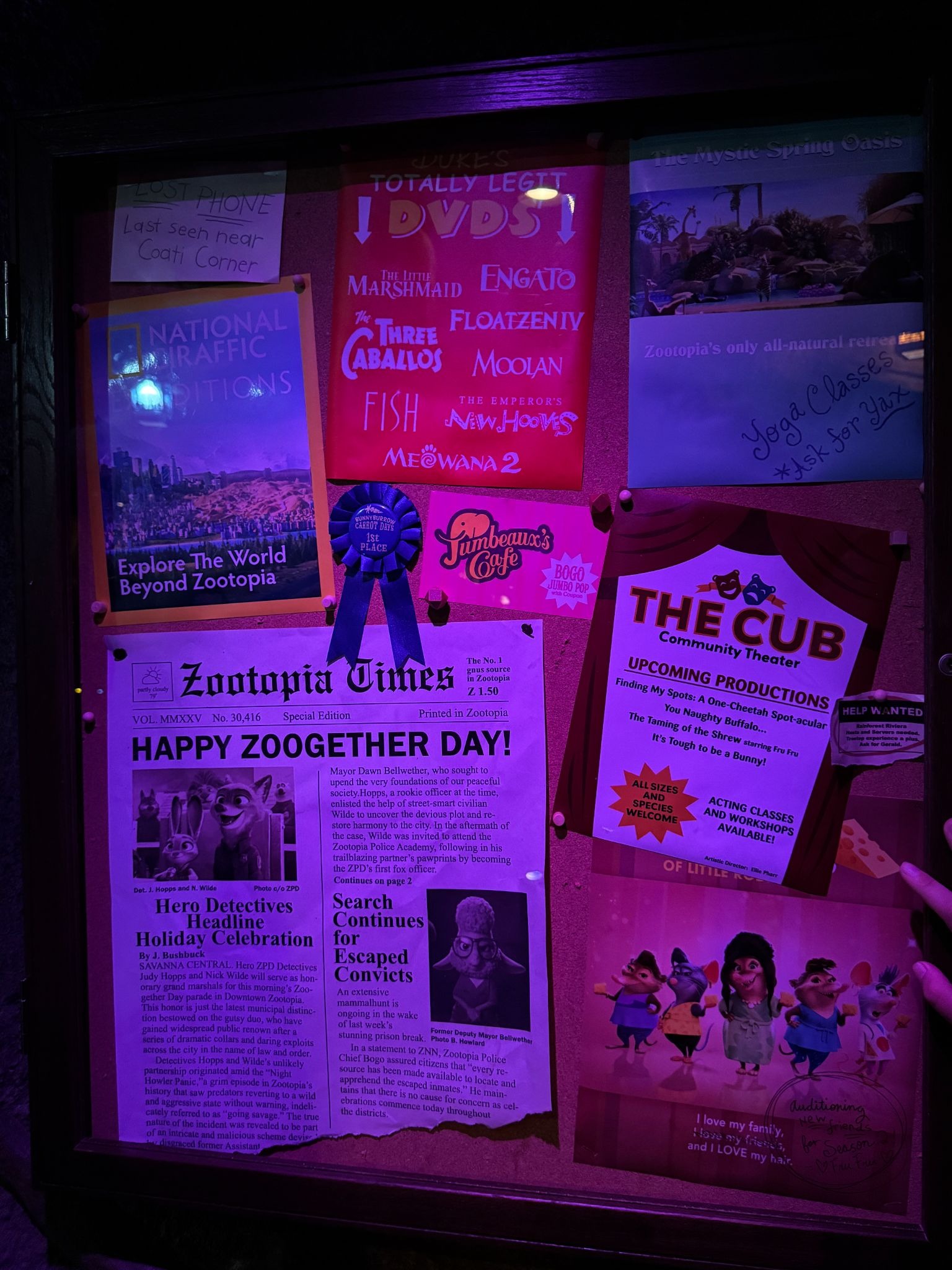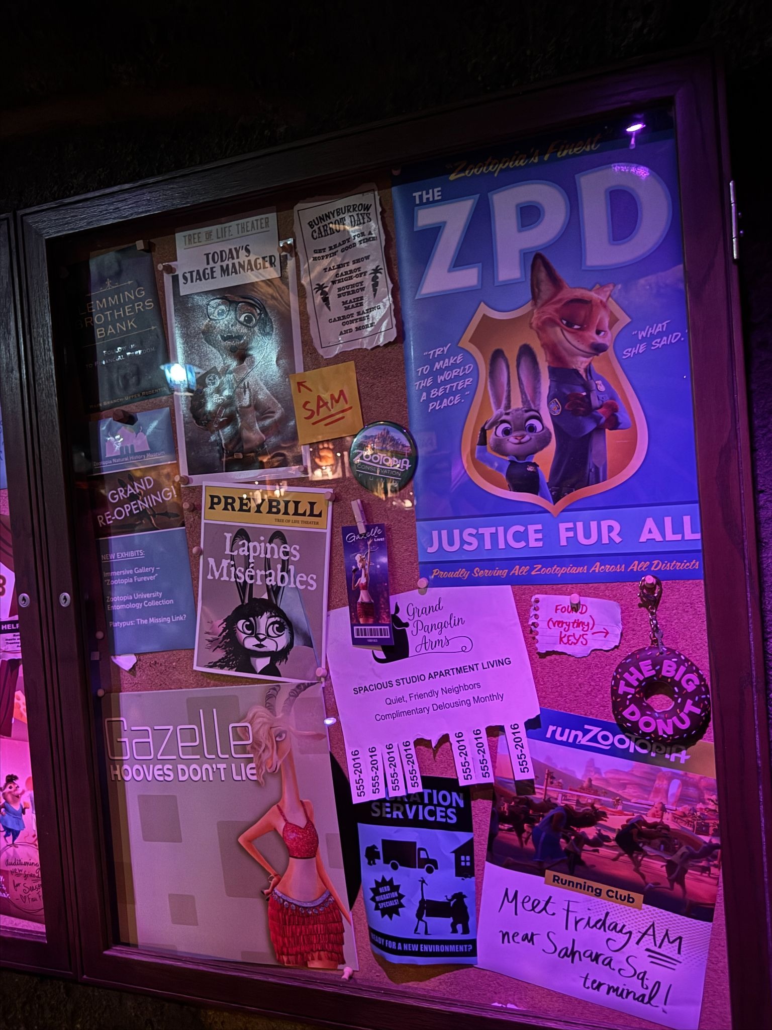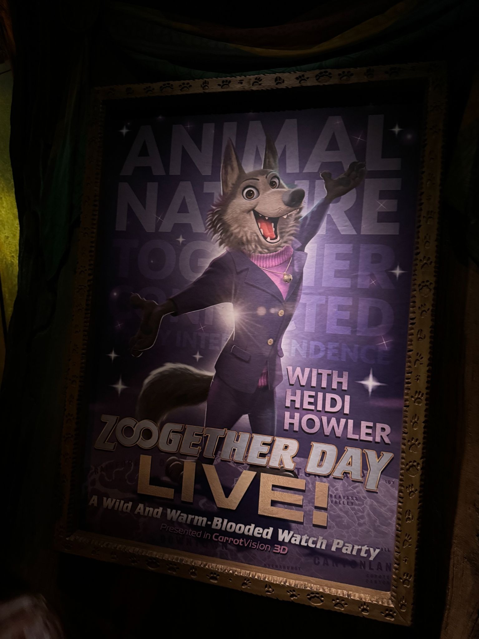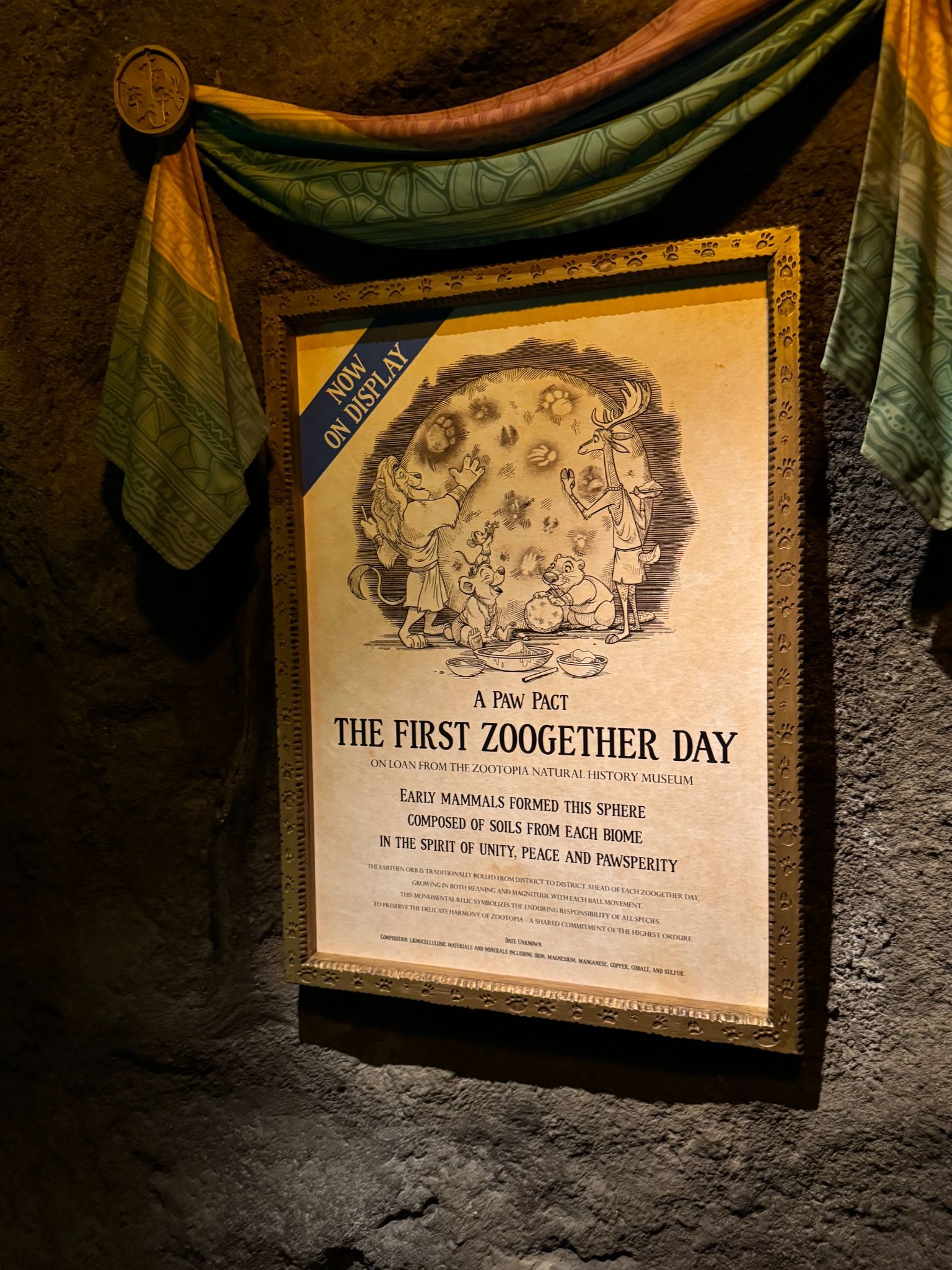 - Once entering the inside portion of the queue, there are even more details inviting guests into the Zoogether Day festivities, including more posters, bulletin boards, artifacts, a Pawdora jewelry display, and a tiny entrance to the theater for Zootopia’s smaller residents.