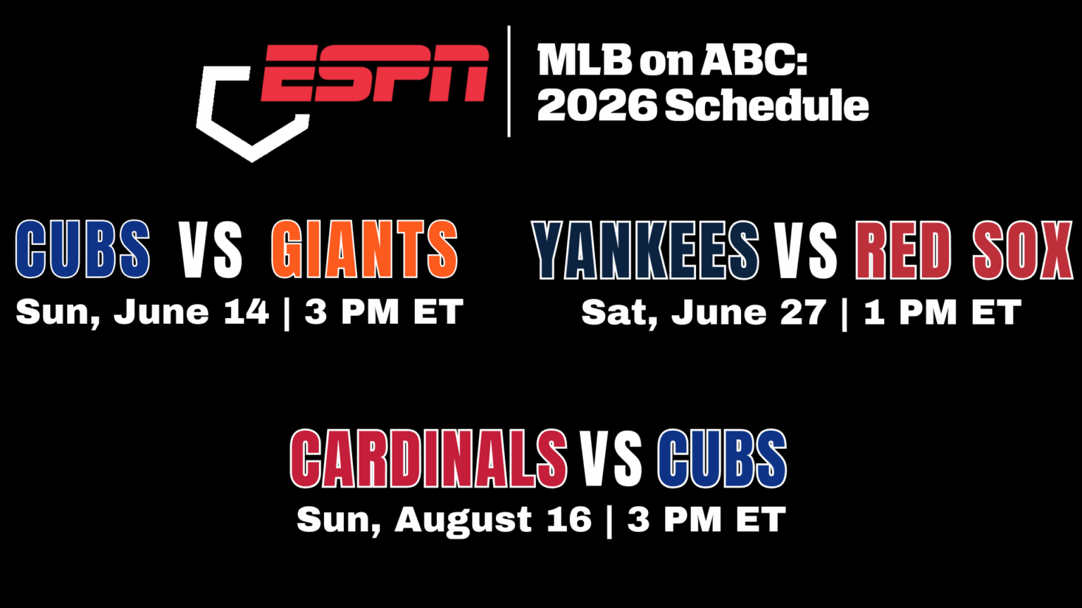 - ESPN has announced that three marquee Major League Baseball regular season games will air exclusively on ABC during the 2026 season, as part of a new rights agreement.
