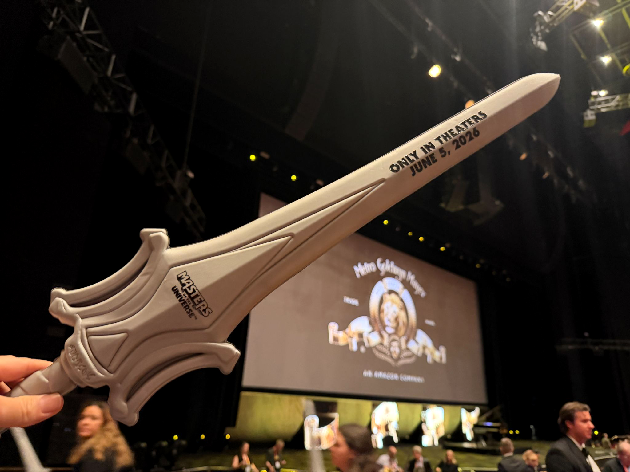Director Travis Knight joined stars Nicholas Galitzine and Camila Mendes on stage, with the audience receiving foam swords on the way in. The crowd responded to Galitzine's "By the power of Grayskull!" with a thunderous "I have the power!" A clip showed Adam in the back of a police cruiser when a beast attacks — he fumbles with his sword until Teela saves him — before cutting to a sizzle of his return to Eternia to face Skeletor as He-Man.