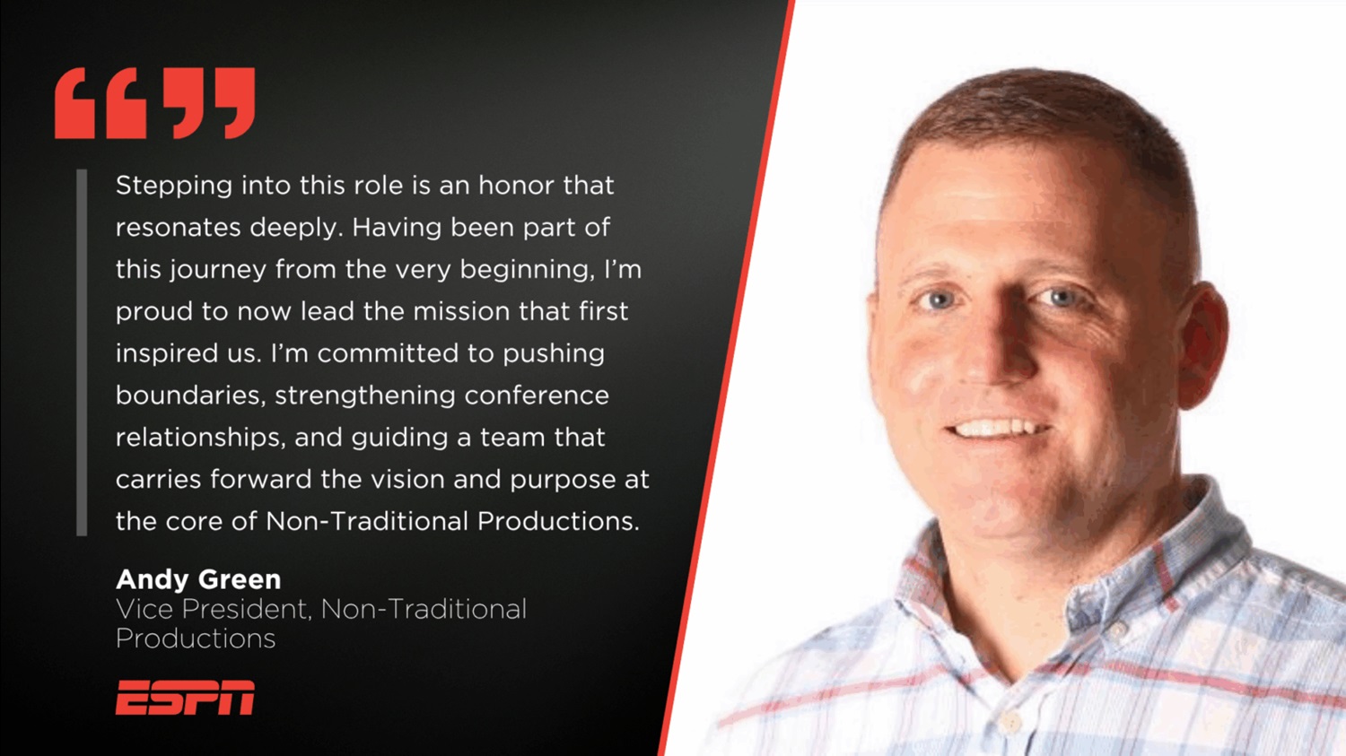- ESPN has promoted Andy Green to Vice President of Non-Traditional Productions, where he will oversee the NTP business, including management of thousands of live events across ESPN's platforms and the school control room initiative.