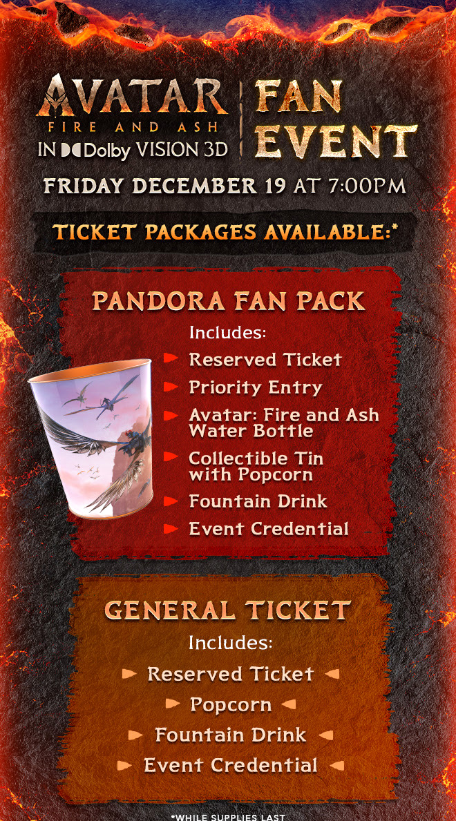 - On Friday, December 19 at 7:00pm, the Avatar: Fire and Ash 3D Fan Event will be held at the El Capitan. There are are two tiers of tickets available.
