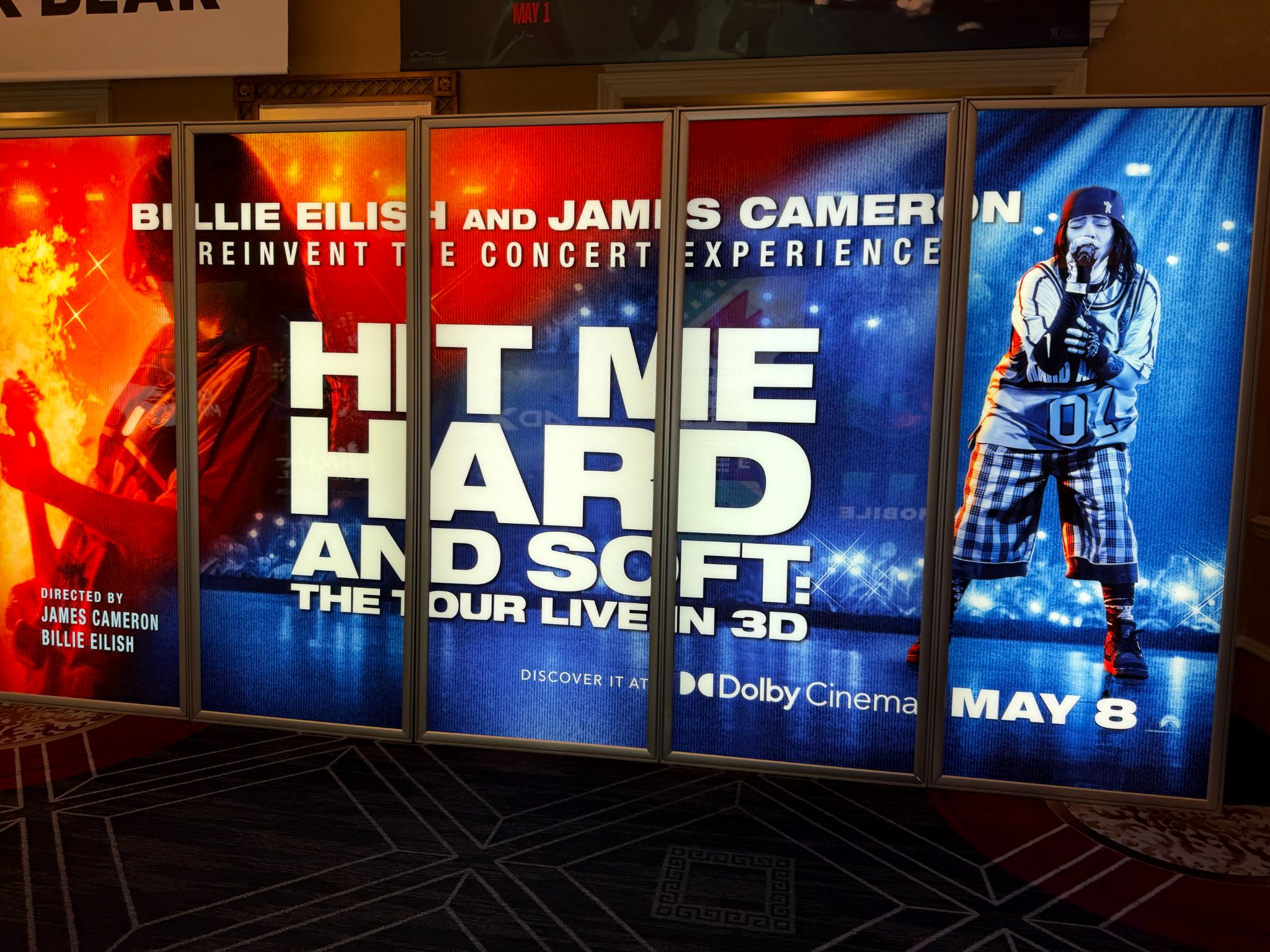 The first major presentation united two Oscar winners on the same stage: director James Cameron and artist Billie Eilish, here to introduce a concert film documenting Eilish's tour. Cameron described an entirely new generation of 3D camera technology developed specifically for the project, including an 800mm long-lens system capable of reaching from the back of an arena with stunning dimensionality, and an ultra-compact gimbal camera about half the size of a cigarette pack that could be placed directly on stage alongside the performer. Eilish spoke about wanting to give her fans — including those who never got a ticket — a genuine VIP experience, and emphasized that this is not a film made for streaming. 3D glasses were distributed for an extended look, and the footage was breathtaking.