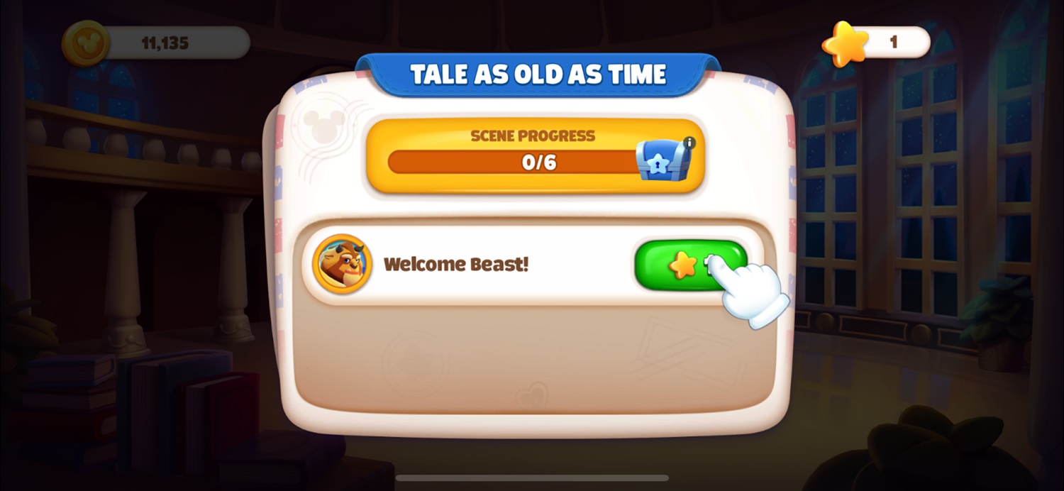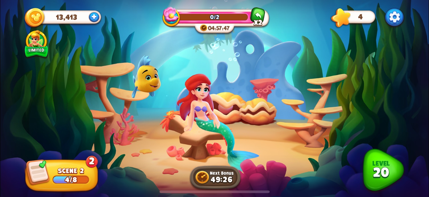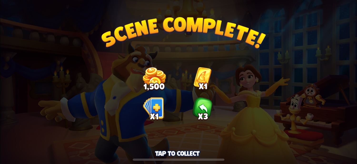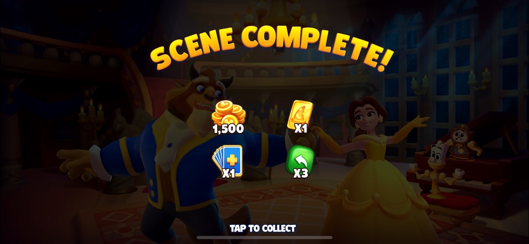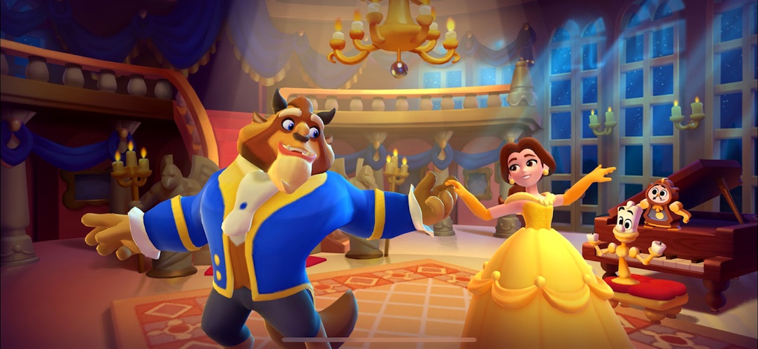 Back to the story, as you complete levels, you’ll collect stars that can then be used to add to the scene. For example, in this first scene, I was able to use my stars to decorate the ballroom and, eventually, activate Belle’s grand entrance. Once I’d completed all of the levels in the scene and redeemed my stars, the power couple even shared their iconic dance. And with that, I was off to the next scene, The Little Mermaid.