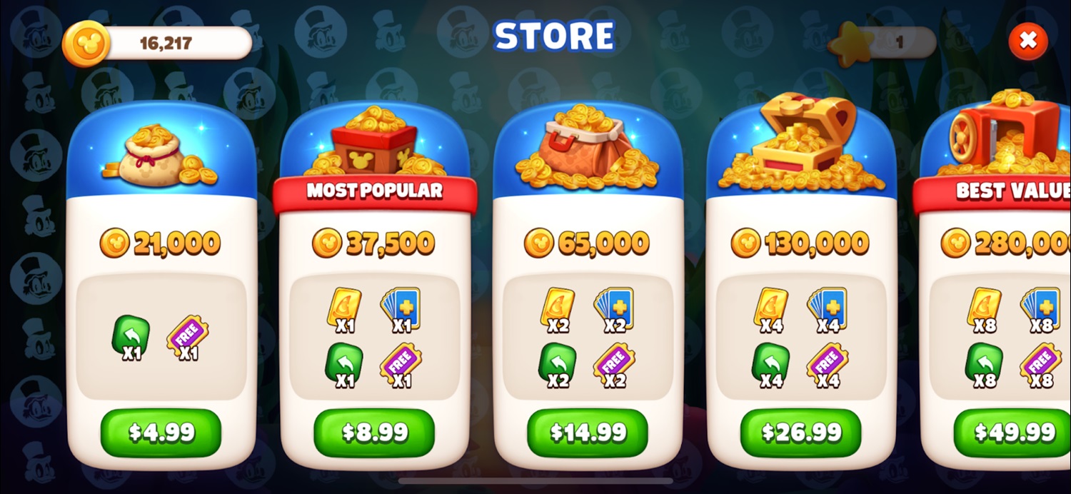While Disney Solitaire is free to play, as mentioned, it does offer some paid powerups with various supplies. These start at $1.99 (for 10,000 coins) but go up to $49.99 (a package that includes 340,000 coins, 8 wild cards, 8 extra card packs, 8 undo moves, and “free" play tickets). However, the trade off here is that the game is free of third-party ads, which is nice. Additionally, although you will get some pop-ups for various in-game promotions and purchase opportunities, I haven’t ever felt bombarded with these during my short time playing the game.