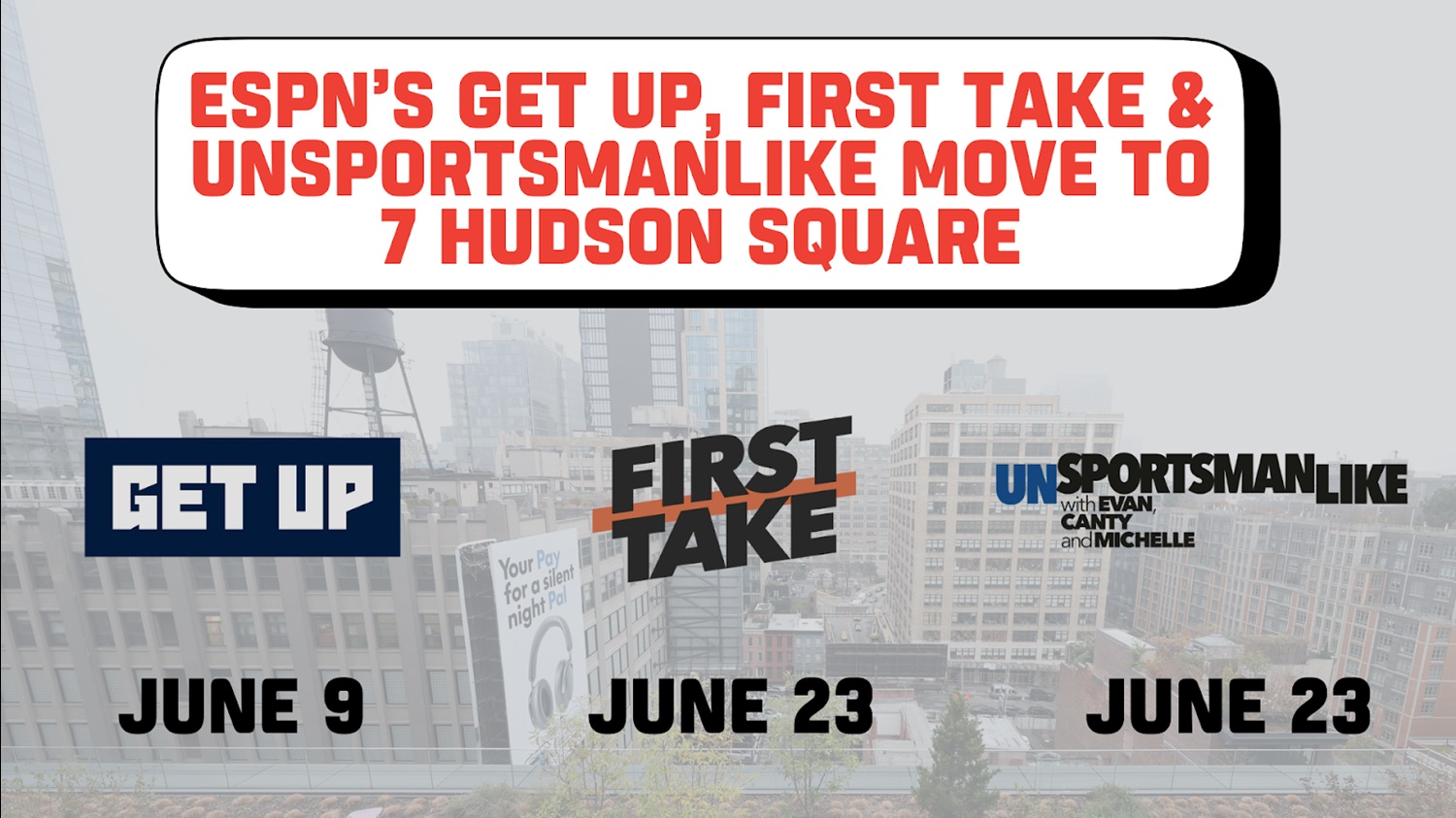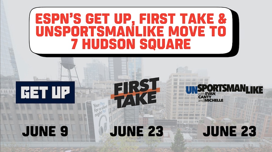 - Get Up will move first, broadcasting from 7 Hudson Square beginning June 9, followed by First Take on June 23.