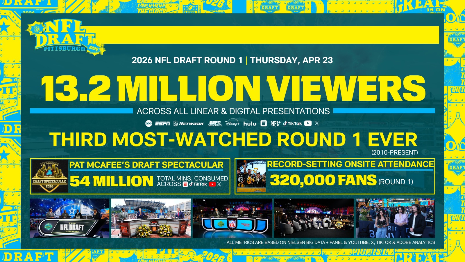 - Coverage of Round 1 on Thursday, April 23 spanned ESPN, ABC, NFL Network, ESPN Deportes, Disney+, Hulu, the ESPN App, NFL+, YouTube, TikTok and X.