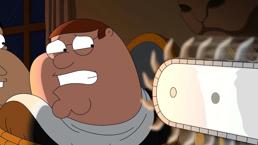 After being chased through the woods by the same two maniacs wielding chainsaws (Peter has to help one of them get their chainsaw started by priming it and making sure the safety trigger is activated), the gang find themselves begging for help at the dilapidated home of a woman in another scary costume. By this point in the episode, it was very obvious to me what was actually going on, which is why I expected a switcheroo at the end so we might see something moderately clever, but no– it’s revealed that the maniacs are indeed Lois, Bonnie, and Donna scaring their husbands straight. Quagmire makes a semi-funny observation about how nobody had the right to be upset with him, and that’s where that narrative ends.
