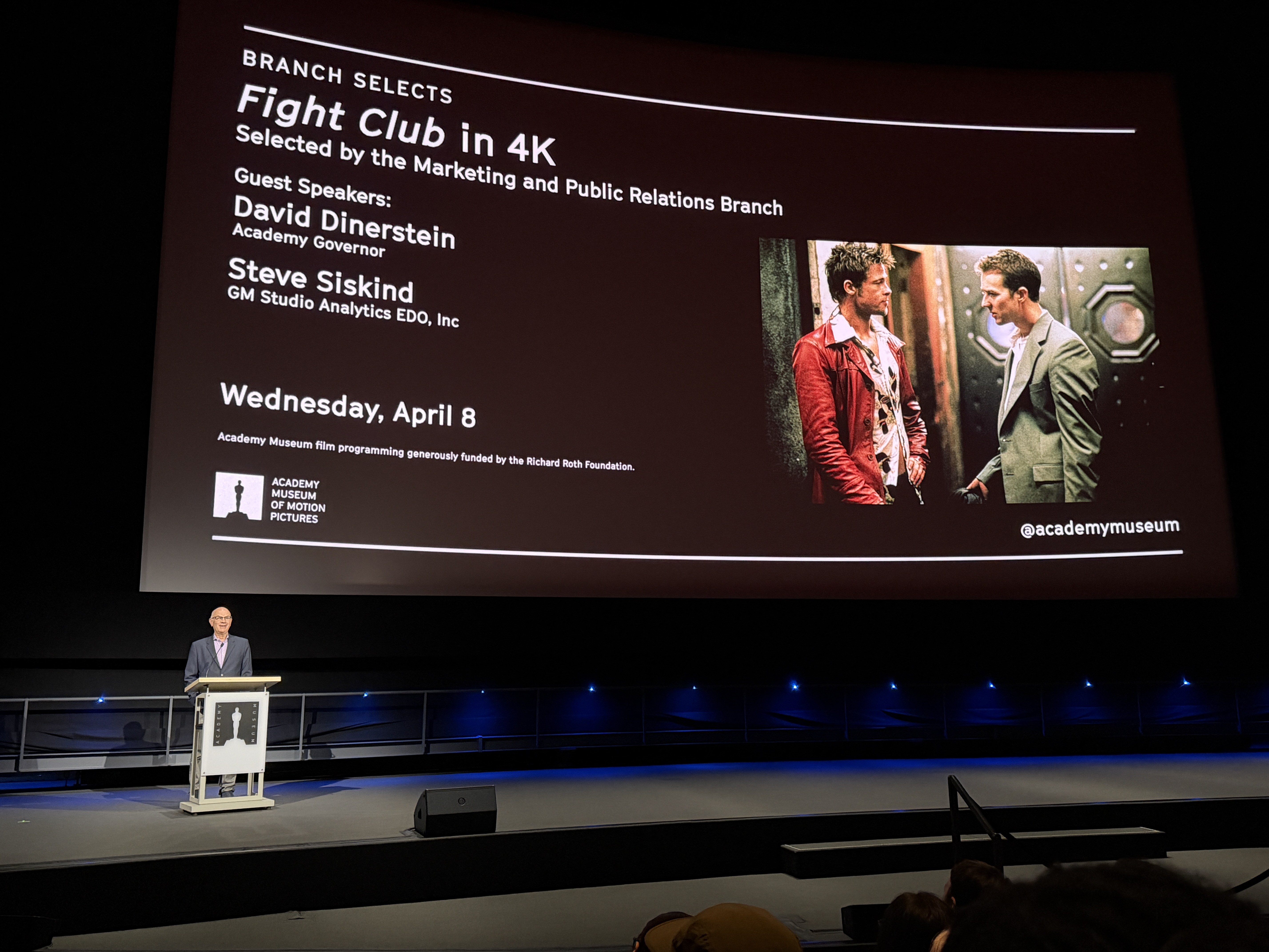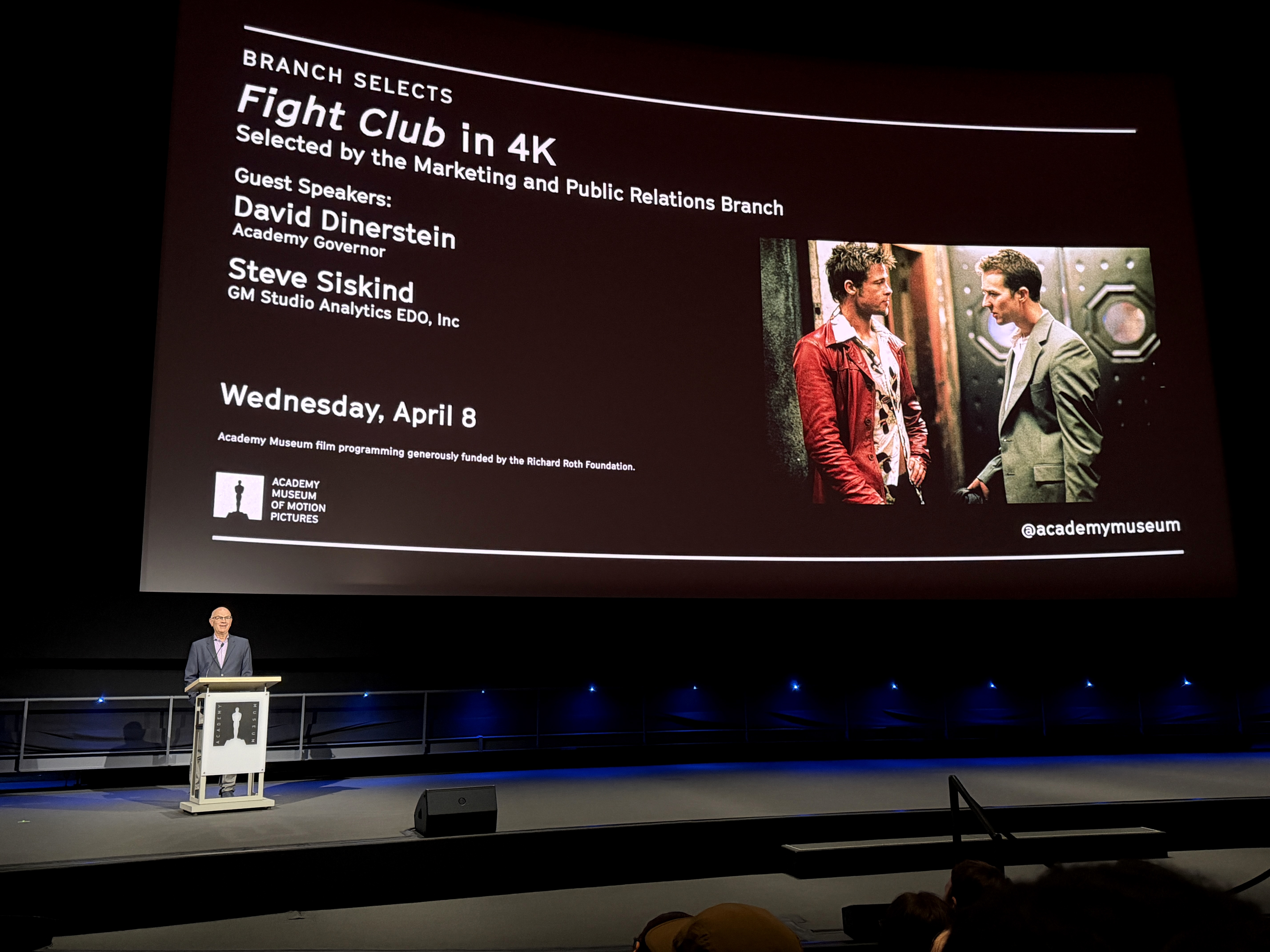 The screening was presented by the Marketing and Public Relations Branch of the Academy, and thus the film's marketing campaign was the focus of the pre-screening guest speaker presentation. Fight Club has an interesting place in cinema -- and marketing -- history, as in its initial 1999 release, it was highly divisive with critics and a box office bomb. However, it went on to became a sensation via the home video market, gaining an ever-growing cult following and a critical re-evaluation as the years went by.