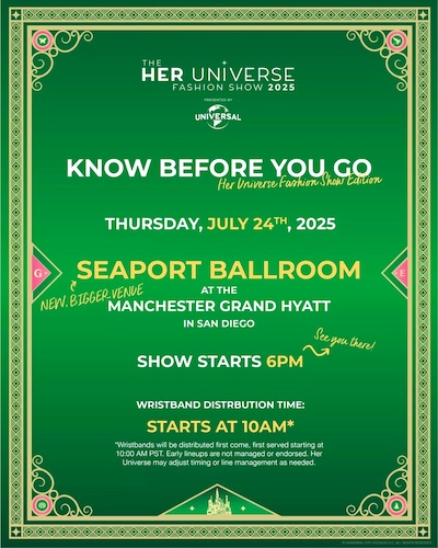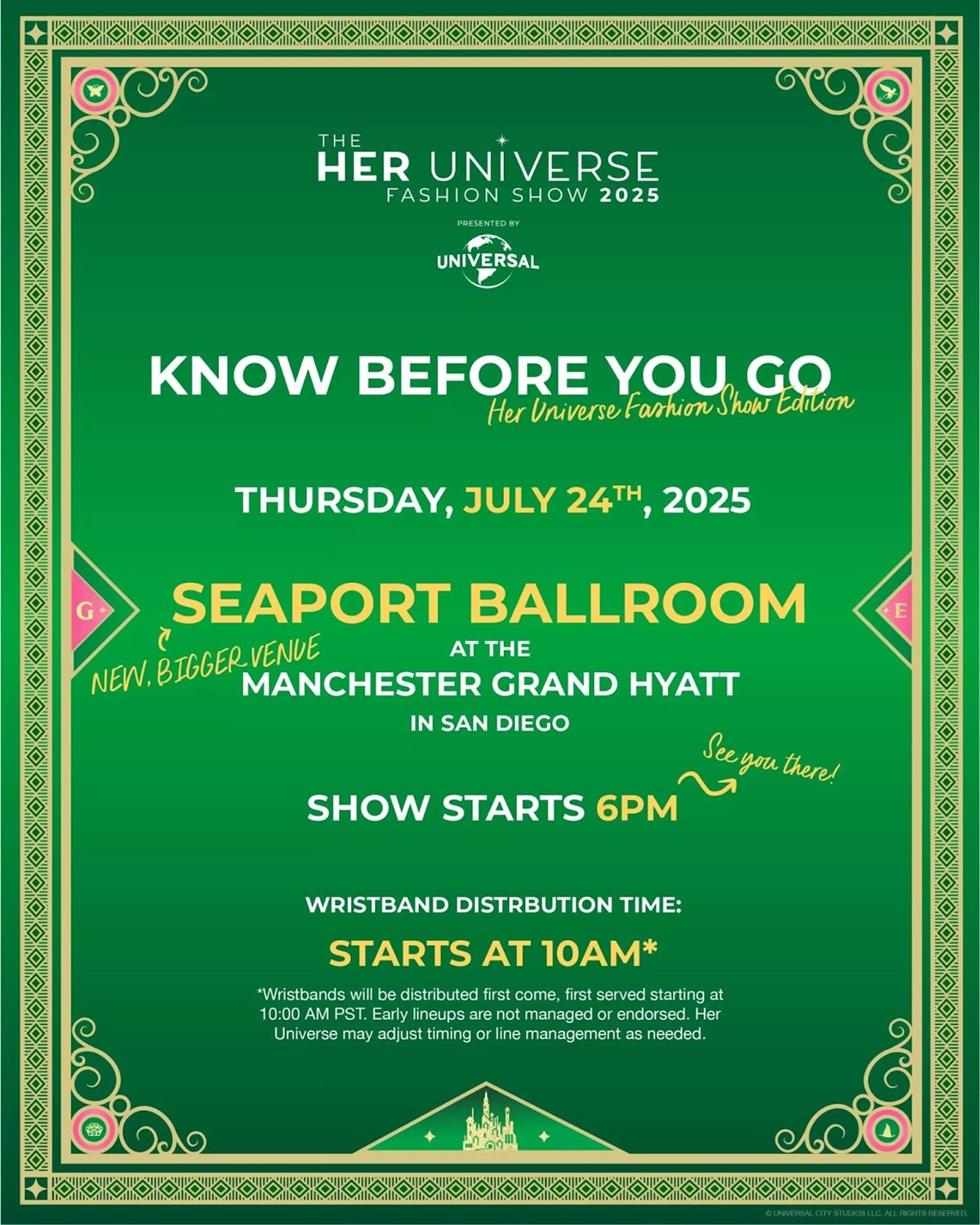 - Update 6/27/2025: Wristbands for this year’s Her Universe Fashion Show will be distributed starting at 10:00 AM at the venue on a first-come, first-served basis.