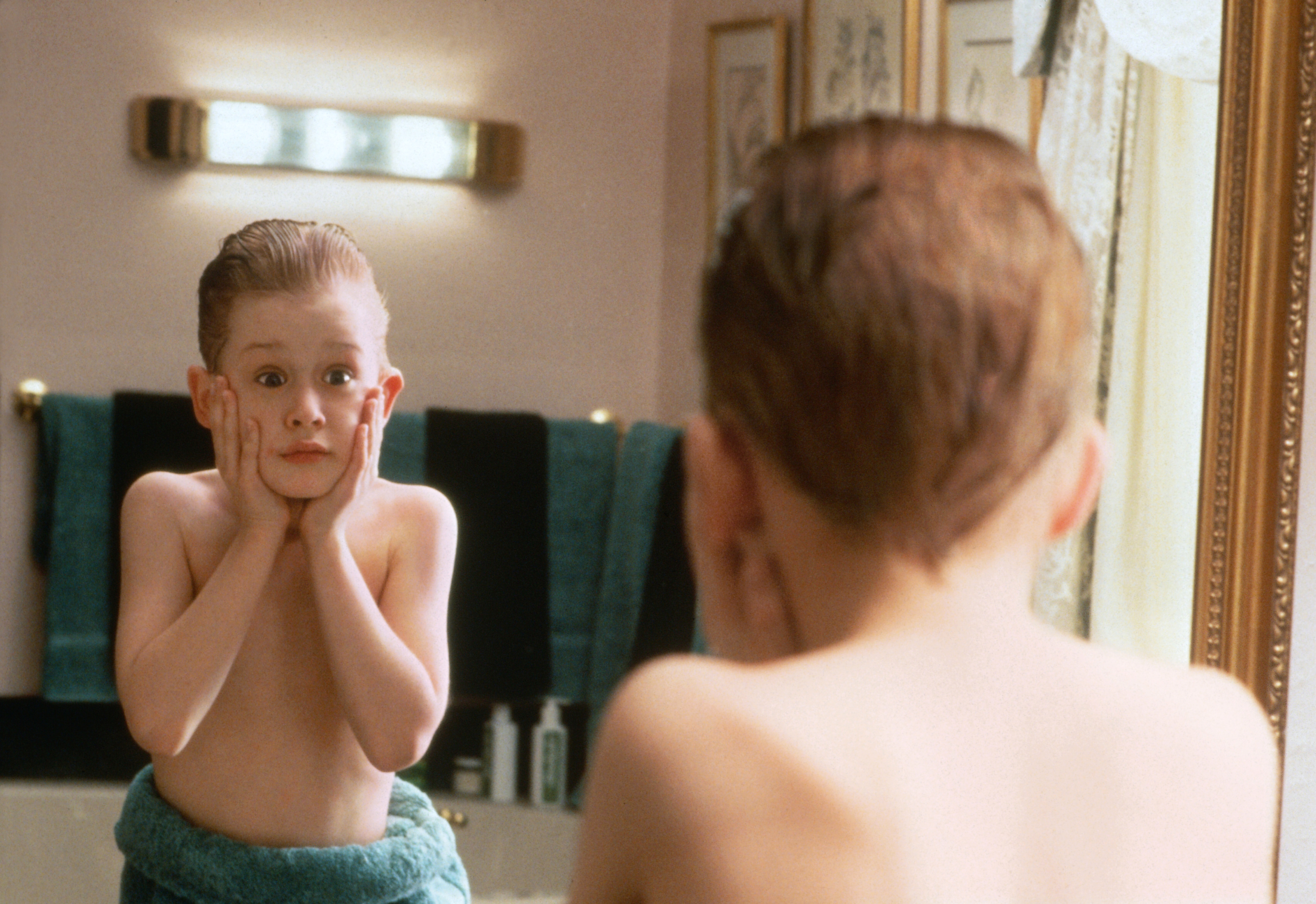 Columbus recalled how funny Culkin was performing this scene on set, though he chuckled about the shaky logic of it, adding "Aftershave doesn't really hurt. To this day, I don't understand why [he screams], because it does not hurt. Maybe it was some sort of acid or something! All I know is that when we screened [the movie] for the first time for a preview audience, until the end of the movie, it got the biggest laugh. And so it became the poster!"