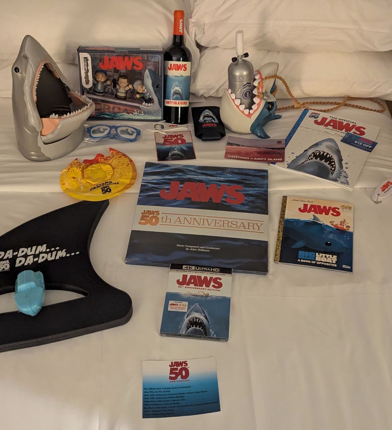 We were also each given a bag of gifts, including the park’s Jaws popcorn bucket, the popular shark sipper, a 50th anniversary vinyl of the original soundtrack by Mondo, a Blu-ray of the film, and even a bottle of Jaws-branded wine.