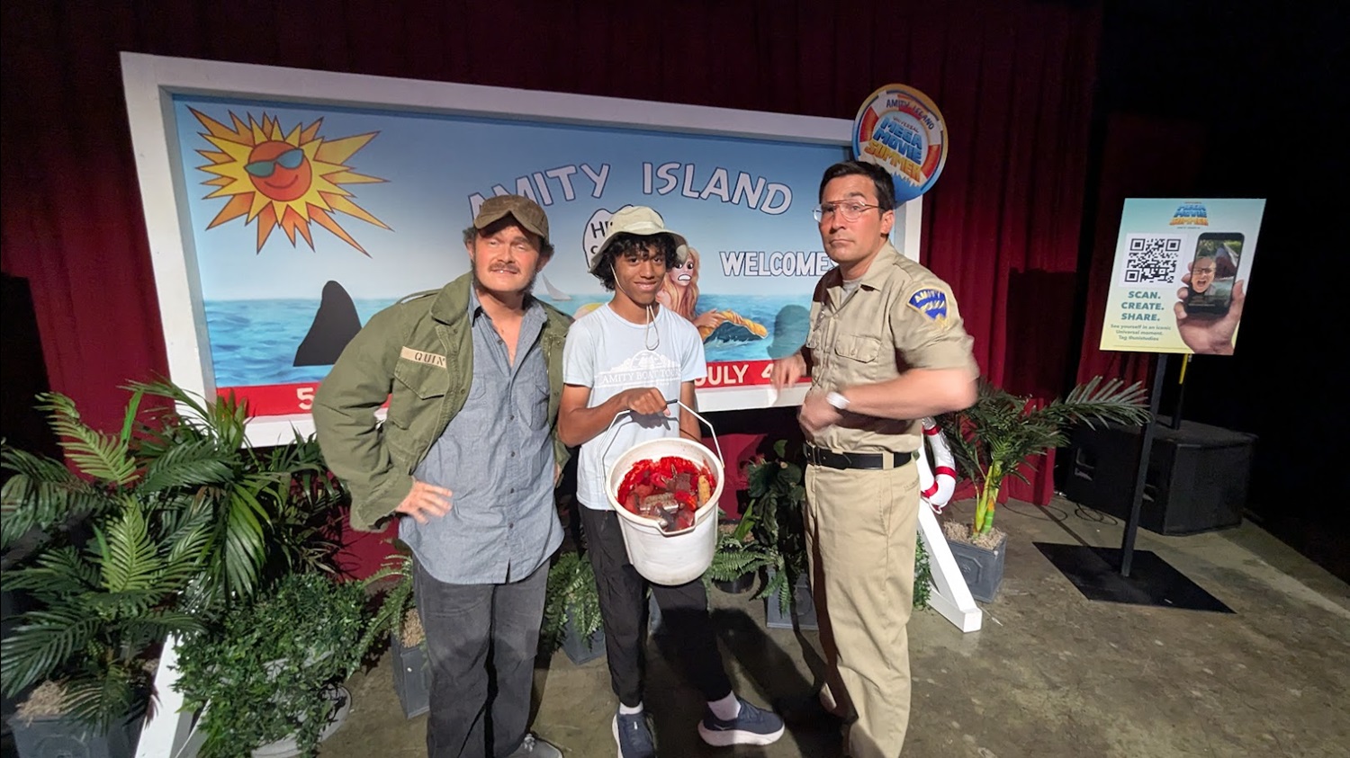 Once inside the theater, we were treated to vintage shark-themed trailers and a cheeky PSA on what to do if you're attacked by a shark. Then came a round of Jaws trivia, in which Gideon correctly identified the year Jaws was added to the Universal Studios Hollywood Studio Tour—earning him two free tickets to the park.