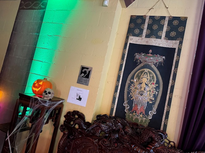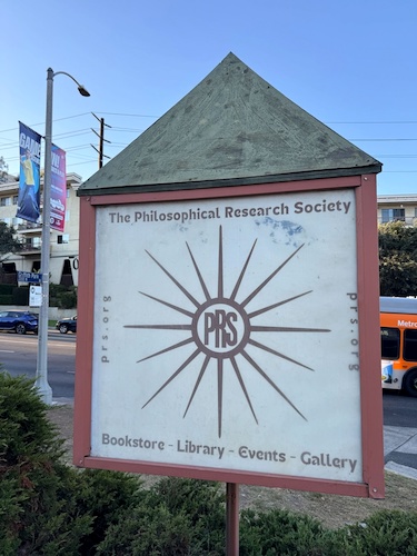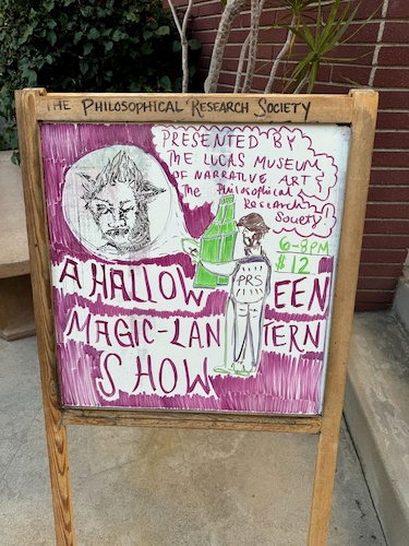 Upon entering the courtyard of the Philosophical Research Society, we found signage promoting the “Victorian Halloween" Magic-Lantern Show, and we also took a look around the venue’s library and gift show, which was full of all sorts of interesting materials on an eclectic variety of subjects. There was also a calendar of events posted for October.