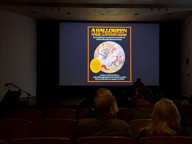The audience at the Philosophical Research Society was enthralled by the magic-lantern show that evening, and afterwards Borton even stuck around for a Q&A session during which we learned a lot more about the history of the technology and art form. Personally I got a really big kick out of this two-hour event, and I can’t wait to attend more like it– either at other venues around Los Angeles or at the Lucas Museum itself starting next year.