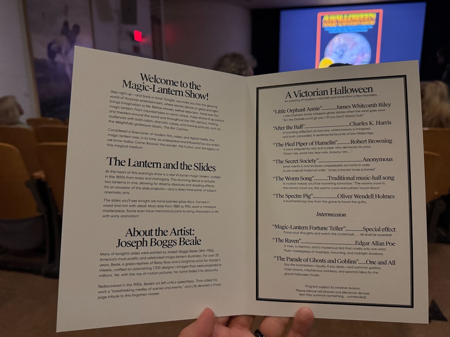 Below you’ll find a look at the program for the evening, which included magic-lantern retellings of familiar stories such as “Little Orphan Annie" by James Whitcomb Riley “The Pied Piper of Hamelin" by Robert Browning, and Edgar Allan Poe’s beloved narrative poem “The Raven."