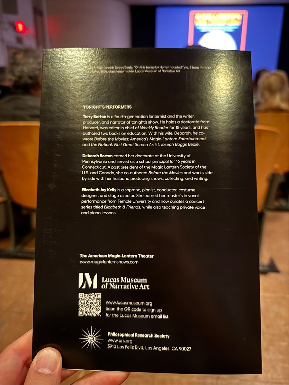 The audience at the Philosophical Research Society was enthralled by the magic-lantern show that evening, and afterwards Borton even stuck around for a Q&A session during which we learned a lot more about the history of the technology and art form. Personally I got a really big kick out of this two-hour event, and I can’t wait to attend more like it– either at other venues around Los Angeles or at the Lucas Museum itself starting next year.