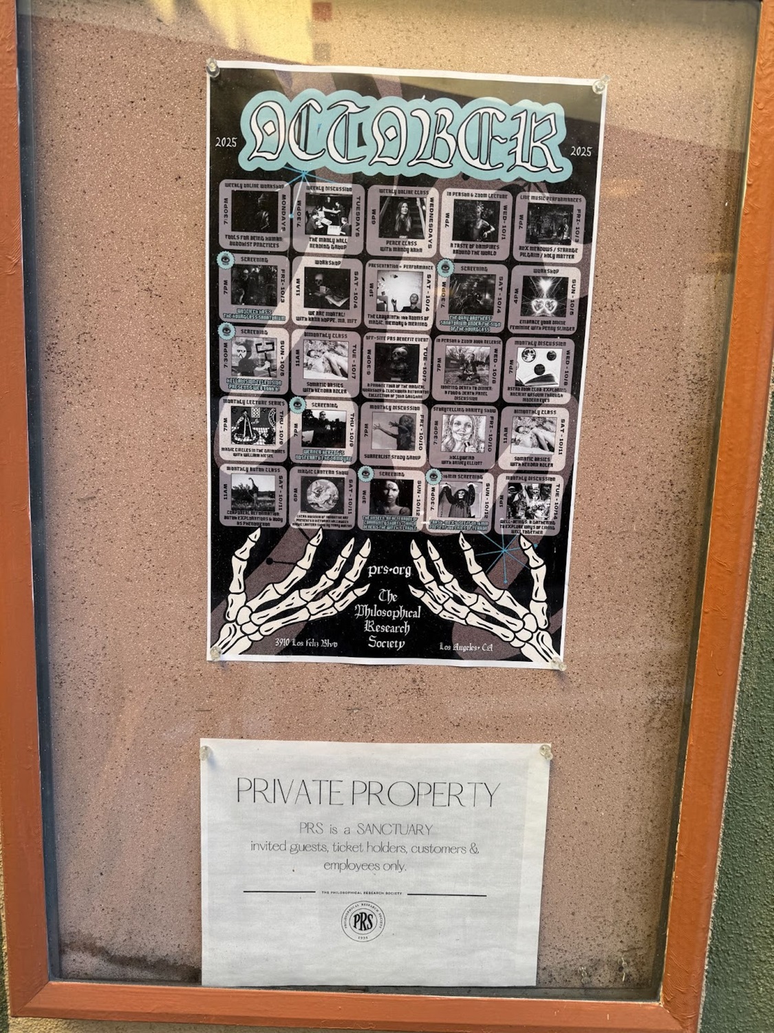 Upon entering the courtyard of the Philosophical Research Society, we found signage promoting the “Victorian Halloween" Magic-Lantern Show, and we also took a look around the venue’s library and gift show, which was full of all sorts of interesting materials on an eclectic variety of subjects. There was also a calendar of events posted for October.